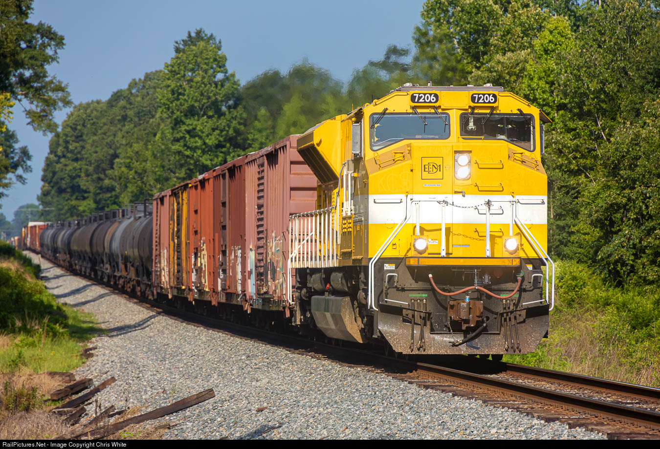 EMDX 7206, a leased SD70ACe-T4 from Progress Rail, makes its way over the many hogbacks of Central Mississippi. Here, 7206 rumbles through the community of Gulde, where in the early 20th century during days of the Alabama & Vicksburg, this was a passenger stop and the RoW was lined with semaphores.