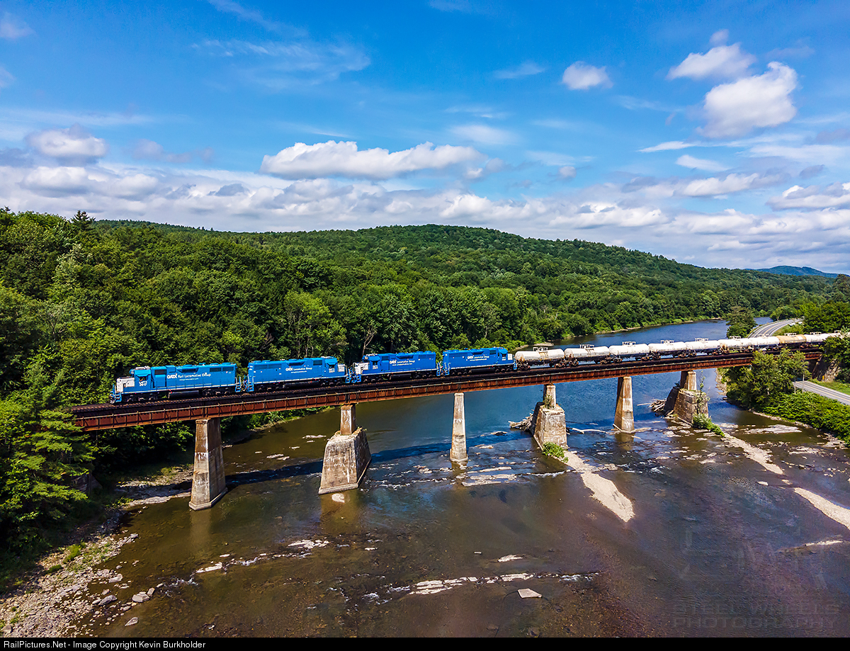 With the Vermont Rail System Northern Subdivision out of service through the end of September for the construction of a tunnel at Middlebury, Vermont, VRS has begun detouring their daily Burlington to Rutland train via New England Central. The detour routes the train over the Burlington, Roxbury and Palmer Subdivisions of NECR, reaching the VRS' GMRC at Bellows Falls. The detours are utilizing 8 GMTX locomotives that have been leased by the State of Vermont. On July 16, VRS southbound detour is crossing the White River on the NECR Roxbury Subdivision at West Hartford, VT.
