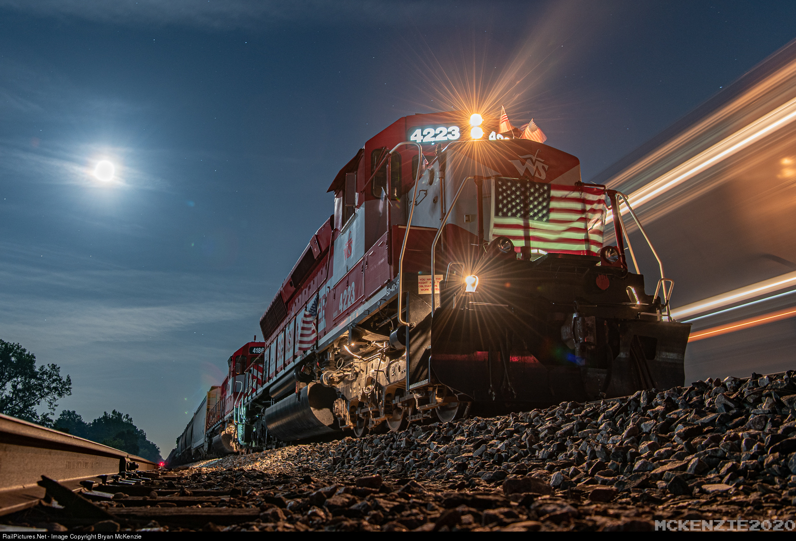 In the early hours of the morning, WSOR 4223, an Ex Rio Grande SD45, pauses to let a CP Hotshot Intermodal overtake them before continuing on through the interlocking in Rondout, Illinois. Due to the 4th of July holiday, the crew was proudly flying flags on the nose and sides of the engine.