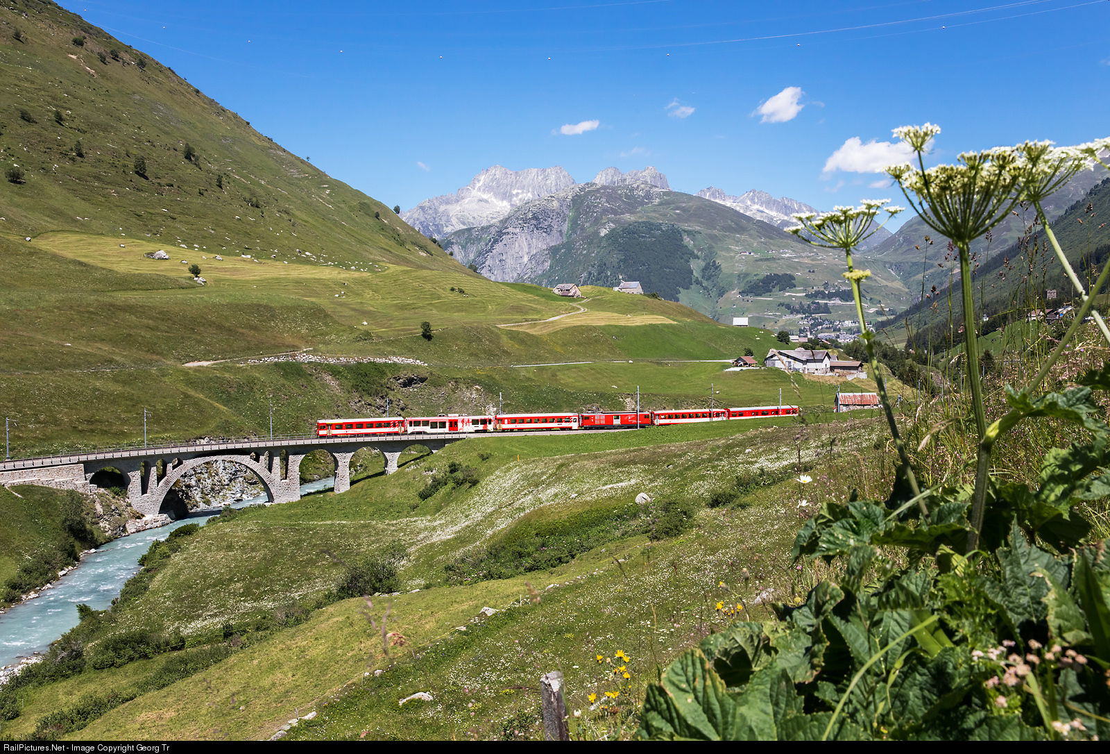 | Push-pull train of the Matterhorn-Gotthard-Bahn (MGBahn) with cogwheel railcar Deh 4/4 II # 92 "Realp" (built in 1979 for the Furka-Oberalp-Bahn) is running the regional train 553 from Andermatt to Brig-Visp, between Hospental and Realp, crossing the Richleren viaduct. The train is reinforced with a second class car B and a BDk for bycicles. |