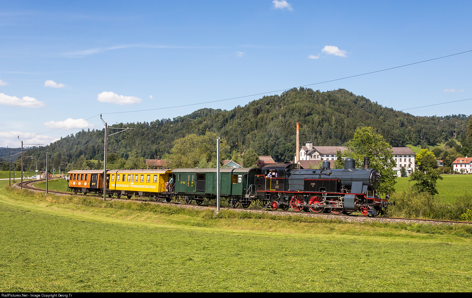 Steam special of the Dampfbahn Verein Zürcher Oberland (DVZO) on the SBB line from Winterthur to Bauma, near Juckern between Saland and Bauma. 2-6-2 T Eb 3/5 # 9 of the Dampfloki Club Herisau, former Bodensee-Toggenburg-Bahn, now operated by the DVZO, is pulling combined baggage/mail car FZ # 203, the yellow FIWA (Fischerwagen) C # 404 from 1912 and the brown JAWA (Jasswagen) CF # 401 from 1910.On this trip, the steamlocomotive was running with a ZUB 262ct automatic train protection (ATP) system, installed as test and approved the day before between Bauma and Saland.