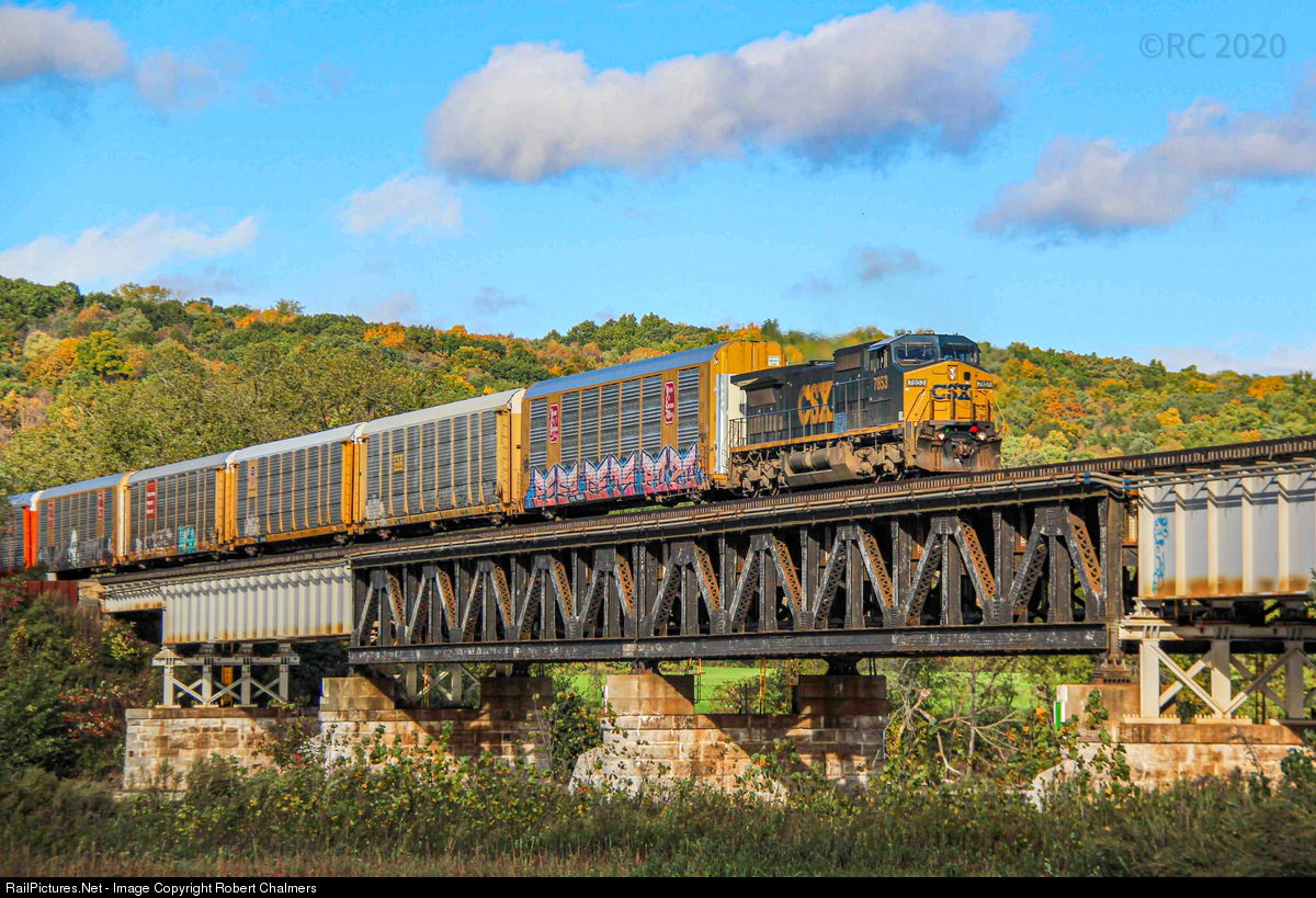 | A few years ago, Dash 8 widecabs were quite common on CSX. Now they are very hard to find along with Dash 9’s. Here back in 2018 we see a unit autorack train pulling loaded racks across the Mohawk River in Rotterdam Junction, NY. |
