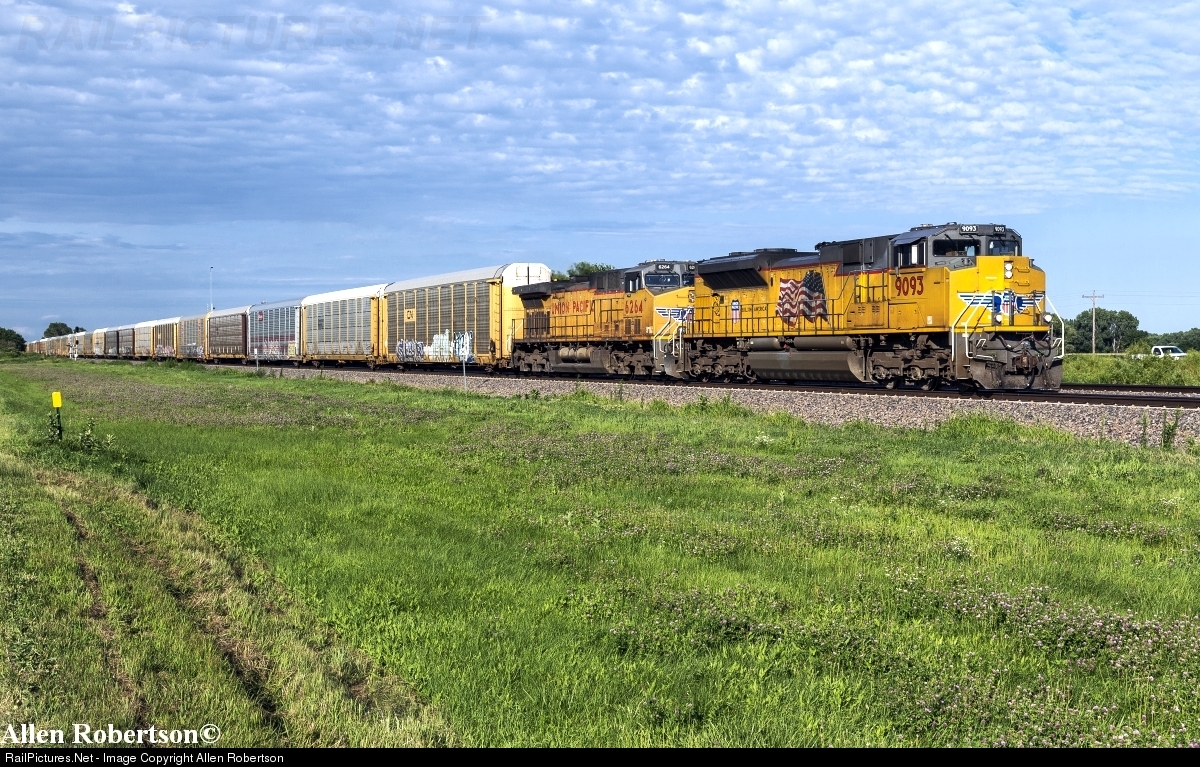 UP 9093 & 6264 lead a westbound train of auto racks.