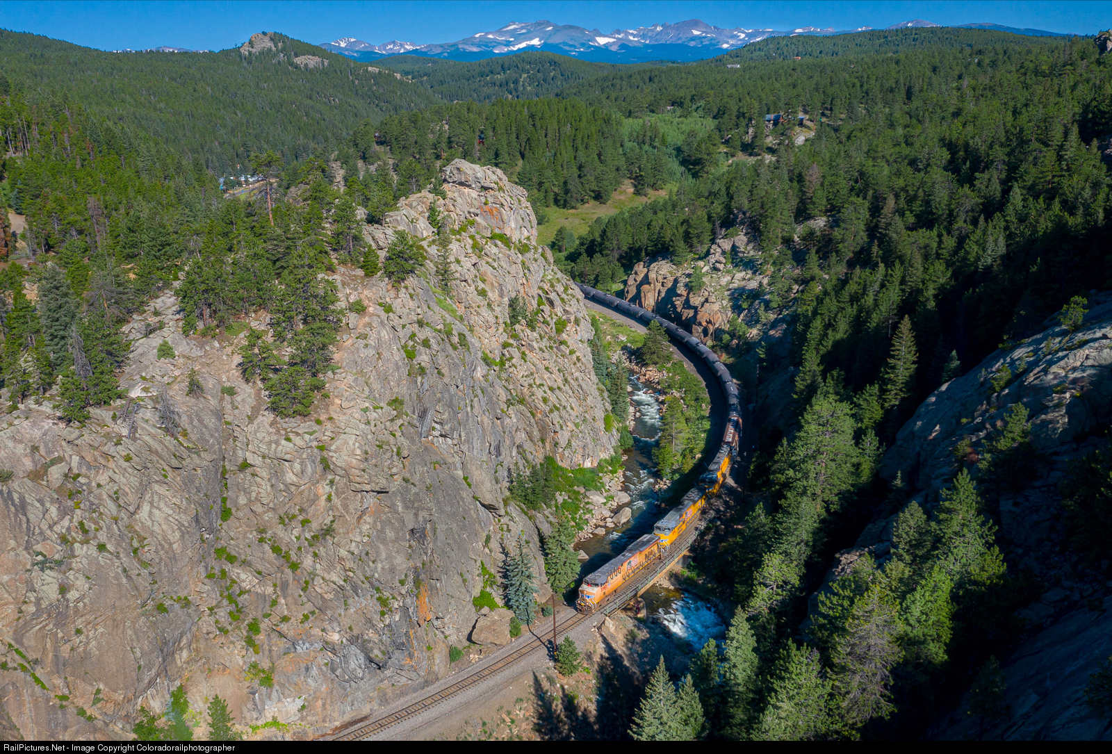 | Rounding one of the tightest tangents on the Moffat Road over South Boulder Creek and some of the deepest canyons, Union Pacific #2567 leads an oil train past Pinecliffe. Shot on Mavic Pro 2. |