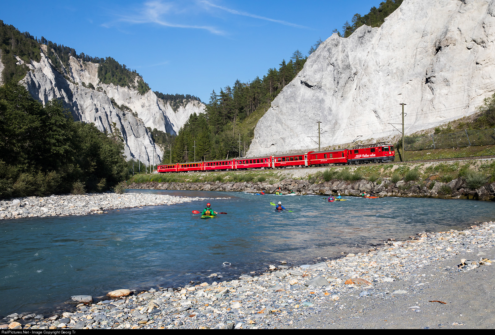 Since the Vorderrhein could no longer drain away, a lake was dammed over a length of about 25 km. In the course of time, the river cut deeply into the landslide masses and the resulting lake could drain away completely. What remained was the Ruinaulta with its steep limestone scree cliffs in imposing erosional formations. The Vorderrhein is very popular for dingies and canoeing. There is a well known canoe school in Versam-Safien at the station.