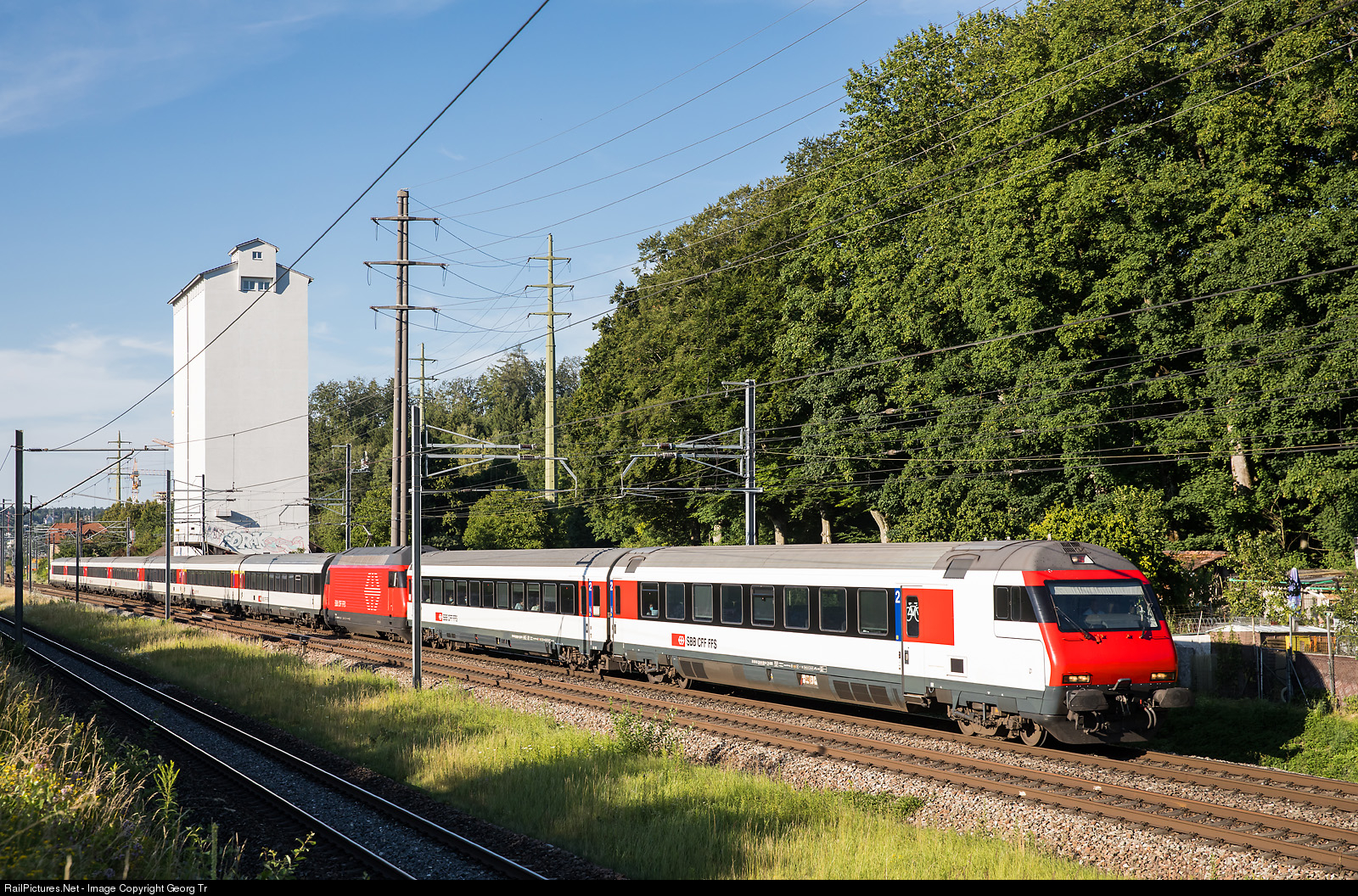 Usually, push-pull trains of the SBB are reinforced on the side of the cab car, here it's the opposite. A "modul" of a cab car Bt and a second class car B type IV is reinforcing the push-pull train with locomotive Re 460 # 003, which is now running between the cars. Train interregio 2132 of the line IR75 from Konstanz via Zürich to Lucerne is leaving Winterthur, passing the Neumühle grain elevator.