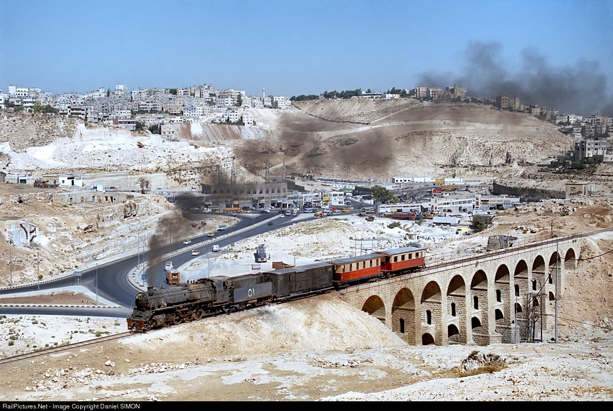 | The 2-8-2 #51 built by Jung in Germany in 1955 is hauling a short passenger train between Amman and Qasir. The train has just passed the imposing ten arch viaduct located 7 kilometers south of Amman. |