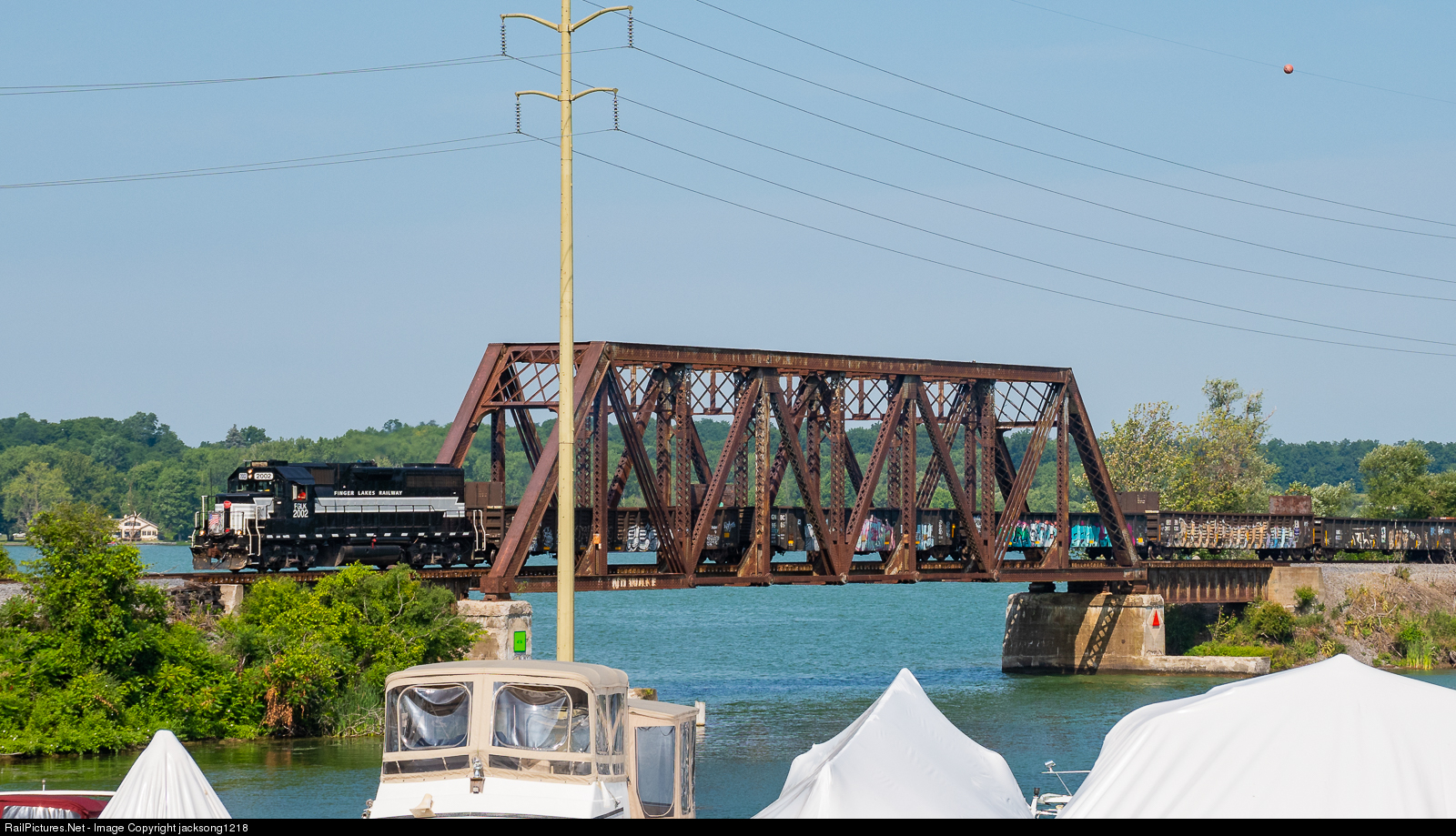 Finger Lakes Railway train GS-2 (Geneva - Solvay turn) crosses over the truss bridge at the east end of the causeway over Cayuga Lake with EMD GP38-2 number 2002 for power.