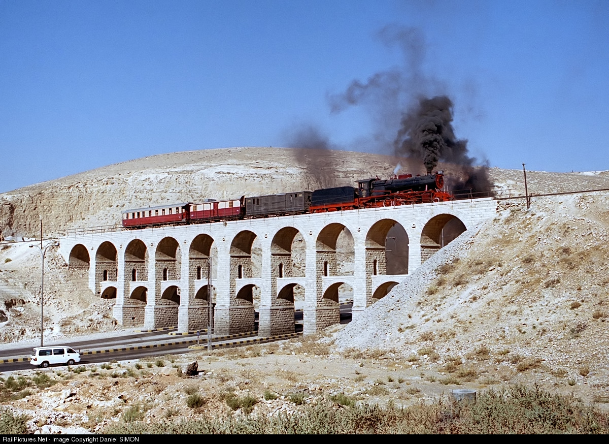 | The 2-8-2 #71 built by Forges Usines et Fonderies Haine-Saint-Pierre in Belgium in 1955 is hauling a short passenger train between Amman and Qasir. The train is crossing the imposing ten arch viaduct located 7 km south of Amman. |