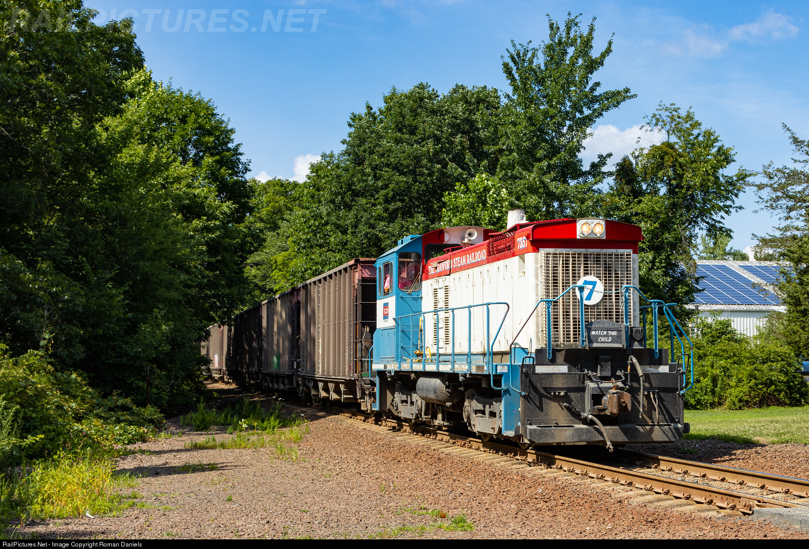 | Branford Steam Railroad SW1001 7357 leads a train of loaded stone cars south at Twin Lakes Road in North Branford, heading for the dock at Juniper Point. This engine rarely left the quarry in recent years as a GMTX Leaser with dynamic brakes was used instead. This week the leased engine is in New Haven getting wheel work so the SW had to fill in as the road power. The Branford Steam Railroad is an industrial railroad serving the Tilcon stone quarry in North Branford, running 6.2 Miles south to the Dock at Juniper Point. The BSRR also interchanges with Providence & Worcester at the yard at Pine Orchard. |