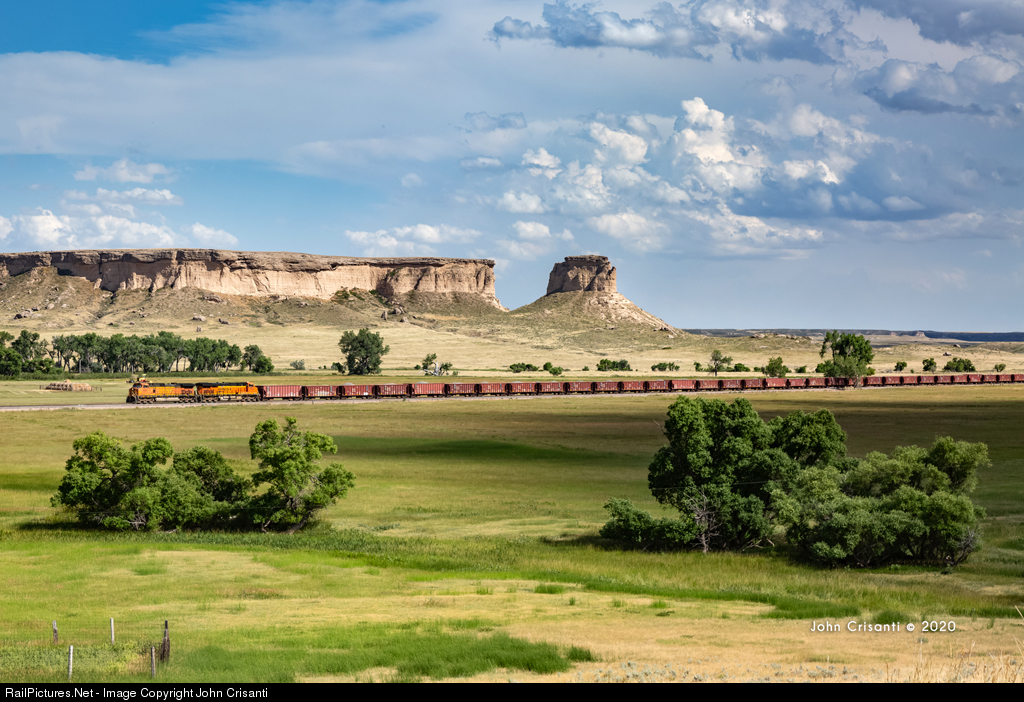 While waiting for storms to initiate over the Laramie Mountains behind me, we see a northbound BNSF Cheyenne-Donkey Creek loaded ballast train move right along through Slater, Wyoming, on July 21, 2020.
