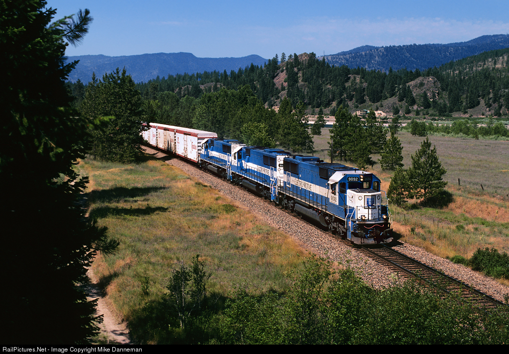 An eastbound Burlington Northern Santa Fe freight approaches Huson, Montana, on June 30, 2000, powered by three Oakway EMD SD60 locomotives. Burlington Northern, and later BNSF, purchased “power by the hour” from 100 of these 3,800 h.p. locomotives built in 1986 that were owned by EMD and leased to Oakway, Inc.