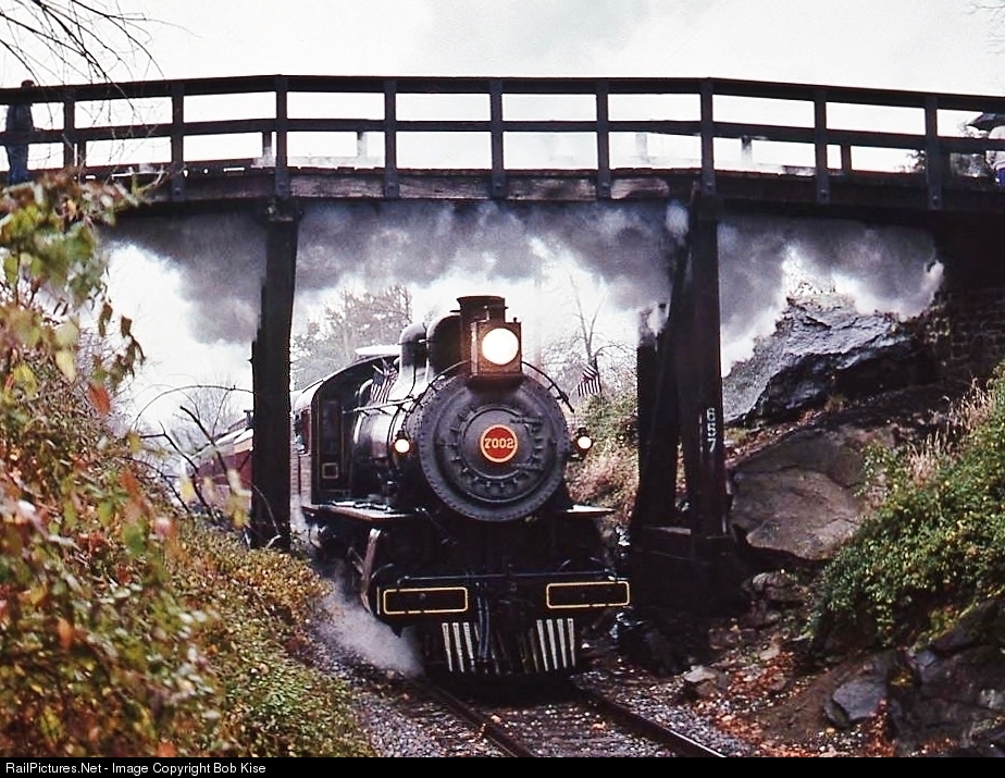The PRR 7002 is pulling the Gettysburg Address Special on the CSX (ex-Western Maryland) between Hanover and Gettysburg, and is at the moment of stalling due to wet rails. The solution was to back down the grade while laying sand. The Strasburg Rail Road, PA Historical and Museum Commission, Amtrak, Conrail, and CSX all cooperated in recognizing the 125th anniversary of Lincoln's famous journey by train to the 1863 battlefield for the dedication of the Gettysburg National Cemetery.