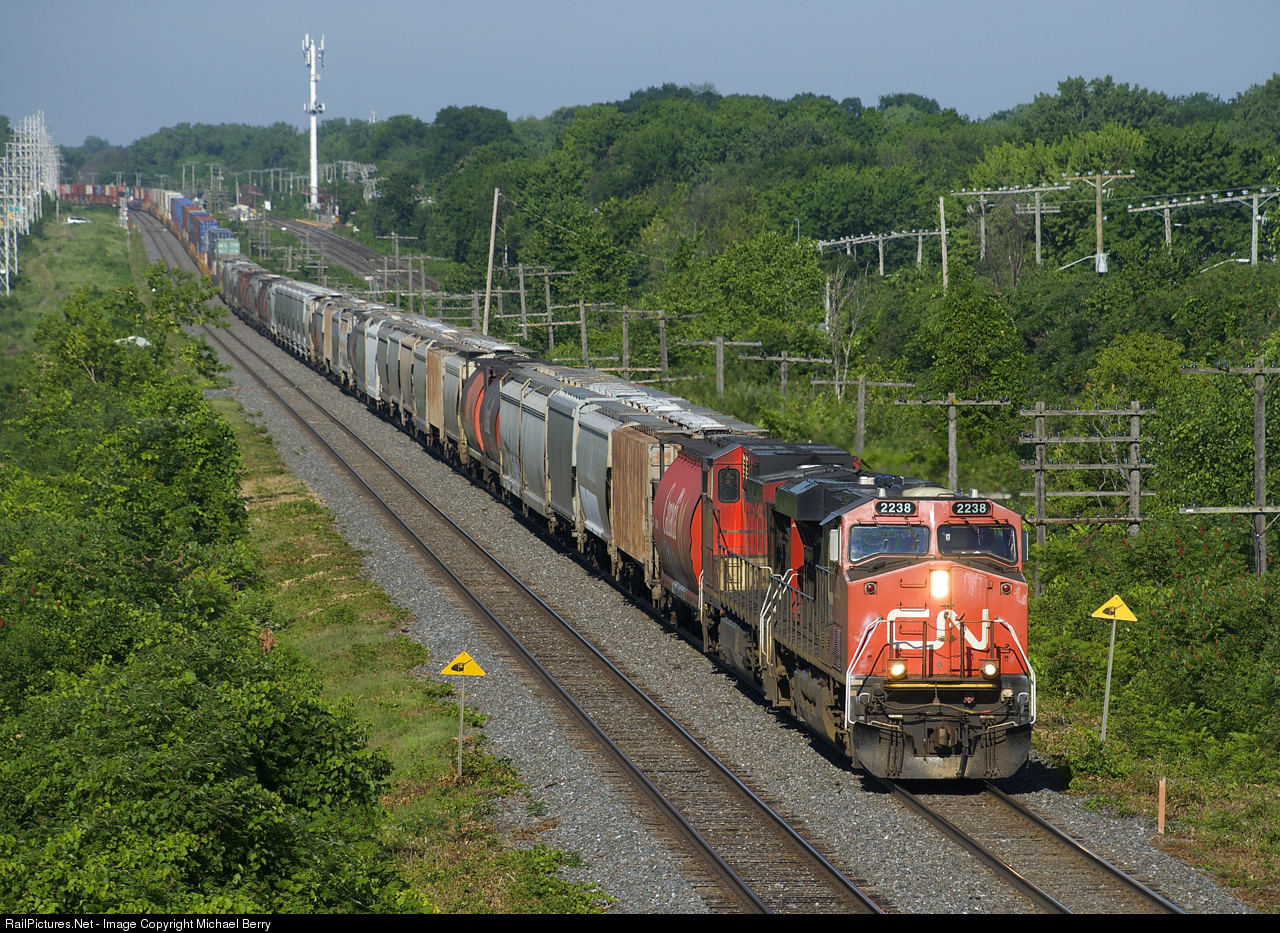 | Grain and intermodal. A 610-axle CN 106 heads east with grain up front, followed by the regular intermodal traffic. Power is CN 2238 and CN 2586 up front and CN 8964 mid-train. |