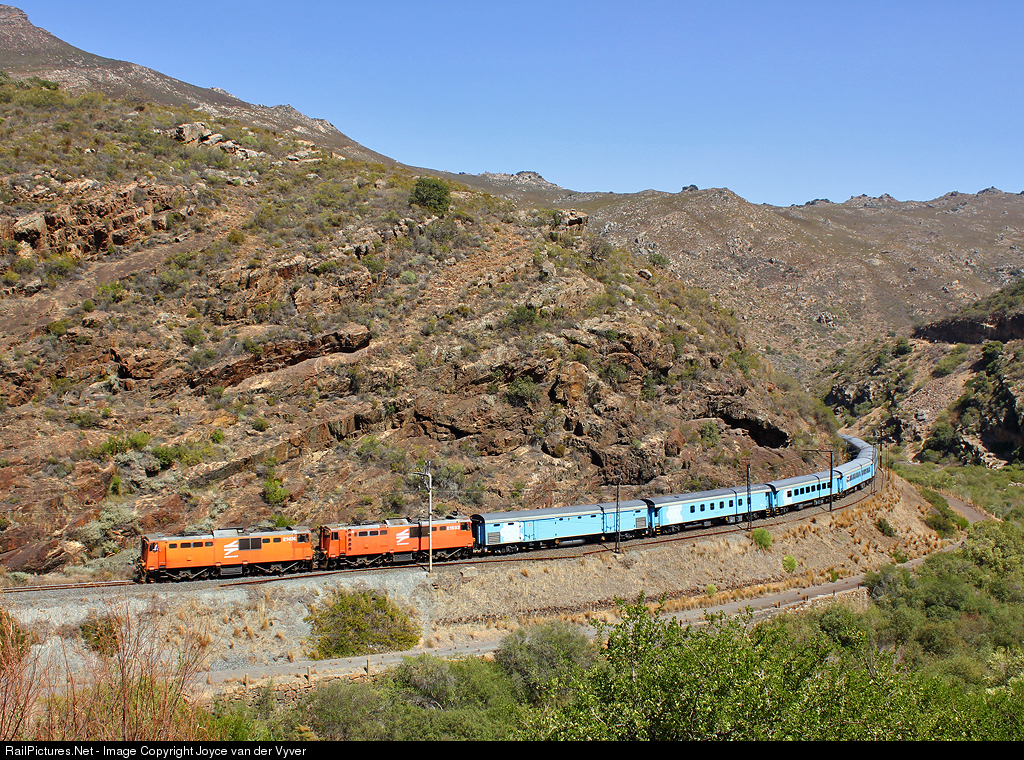 The Premier Classe passes through the Nuwekloof behind 2 class 6E1s in the Spoornet orange livery heading north to Johannesburg.