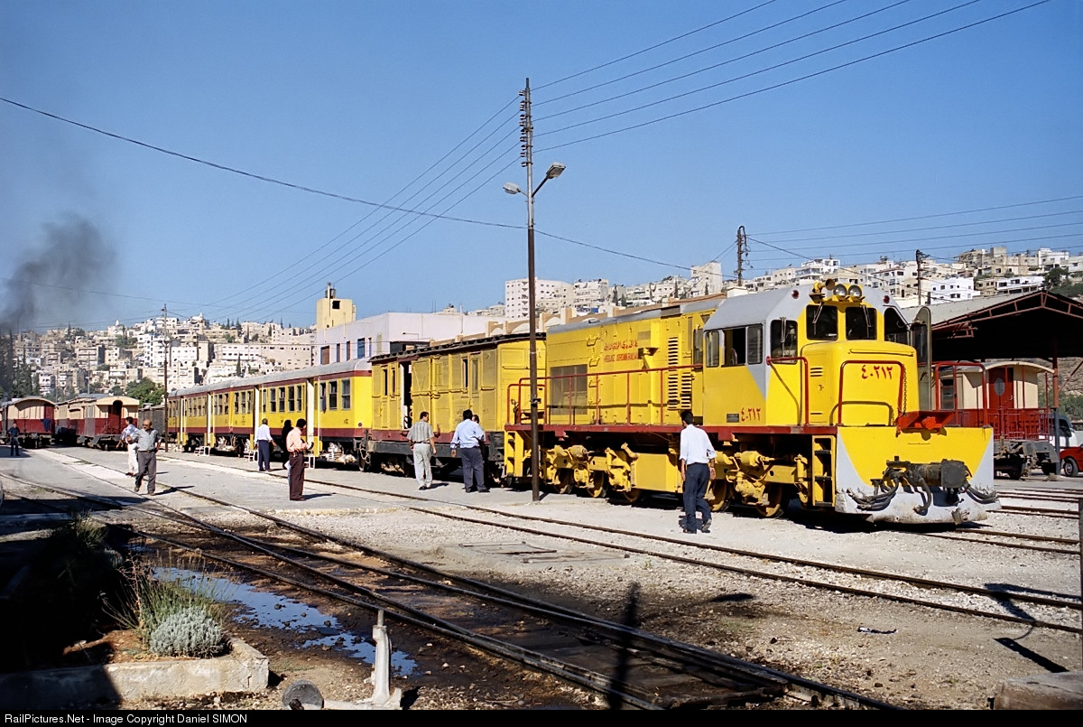 | On Monday 11th September we were told that the International train linking Amman in Jordan and Damascus in Syria now runs twice a week and no longer has a mixed consist. The train comprised the GE U10B diesel #40212 hauling two yellow and red 1975 built Romanian bogie coaches and a fourgon. The train departed at 8.40 am, thought to be 40 minutes late. |