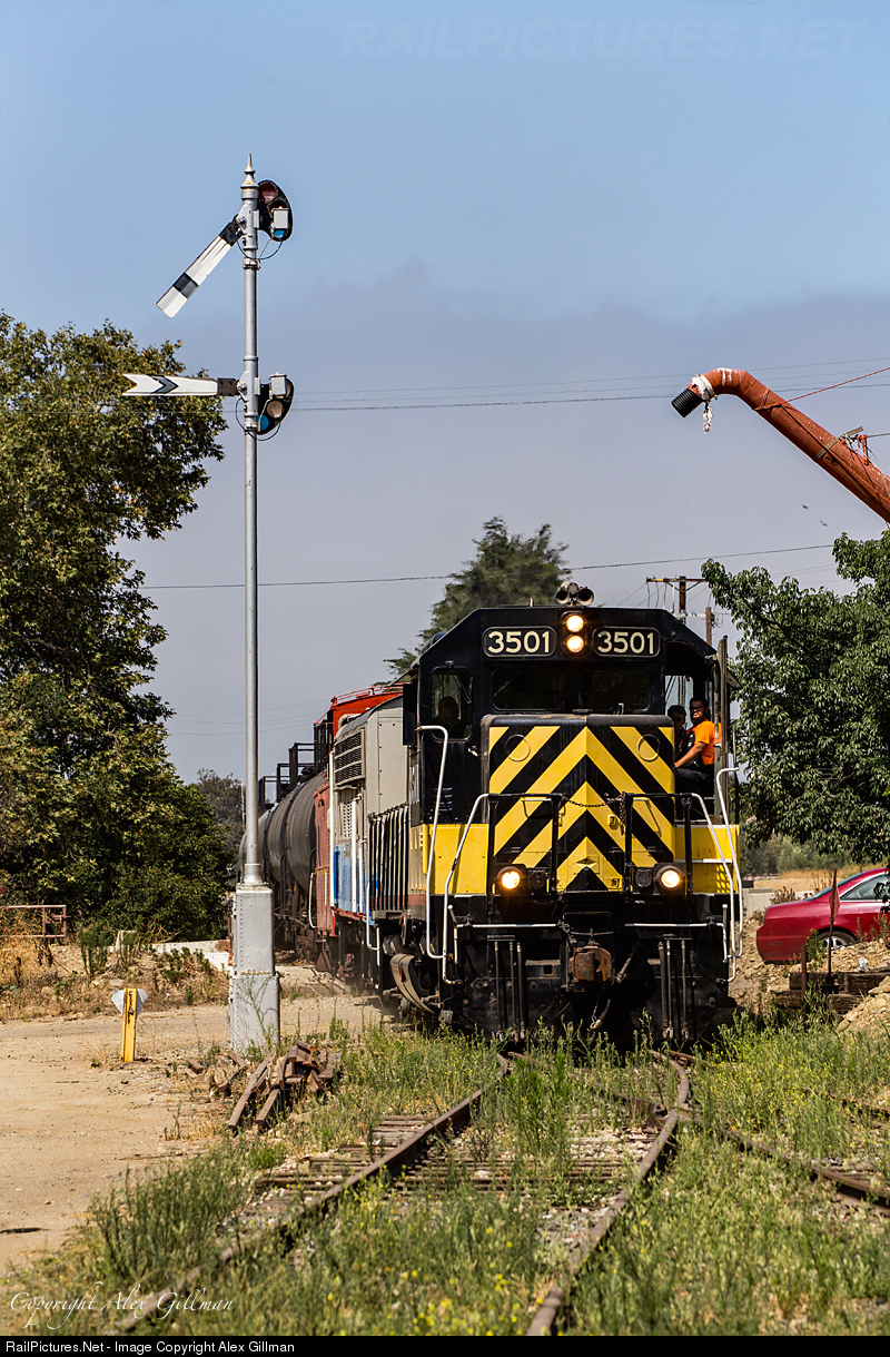 As the rear of its train clears the Highway 126 grade crossing, FWRY 3501 leads a short string of inbound LPG tank cars for storage as it approaches the semaphore signals at the "Loose Caboose."