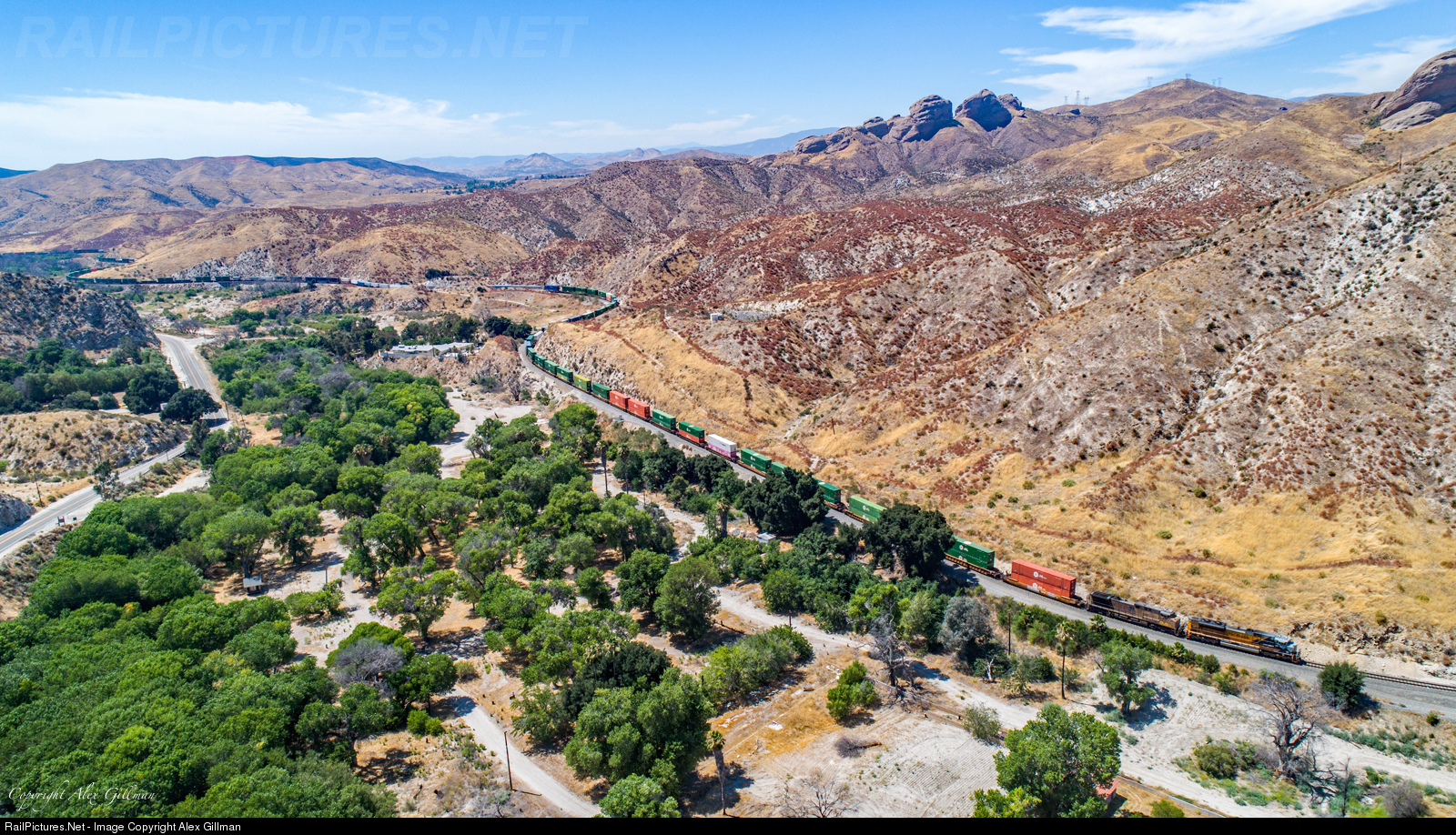 Union Pacific's daily, northbound ZLCLT (Los Angeles, Calif. - Lathrop, Calif.) twists and turns between Russ and Ravenna as today's heavy train climbs the grade through the ex-Southern Pacific's Soledad Canyon crossing. Part of the original North-South rail connection that linked California together in September of 1876, Ravenna consisted of a small station and water spigot that would quenched the thirst of steam locomotives working through treacherous canyon. It also served as a shipping point for Yucca Dranconis, a type of cactus used at the time for creating a superior grade of bank note paper.
