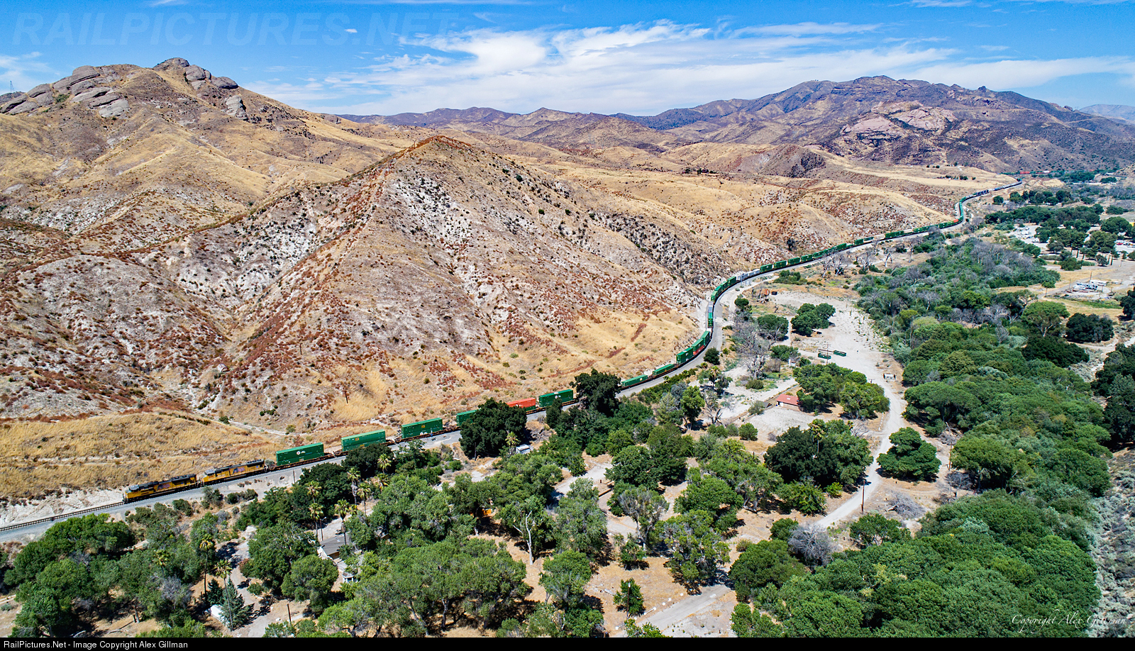 The DPU's on Union Pacific's daily, northbound ZLCLT (Los Angeles, Calif. - Lathrop, Calif.) hotshot train twists and turns between Russ and Ravenna as today's heavy train climbs the grade through the ex-Southern Pacific's Soledad Canyon crossing. Part of the original North-South rail connection that linked California together in September of 1876, Ravenna consisted of a small station and water spigot that would quenched the thirst of steam locomotives working through treacherous canyon. It also served as a shipping point for Yucca Dranconis, a type of cactus used at the time for creating a superior grade of bank note paper.