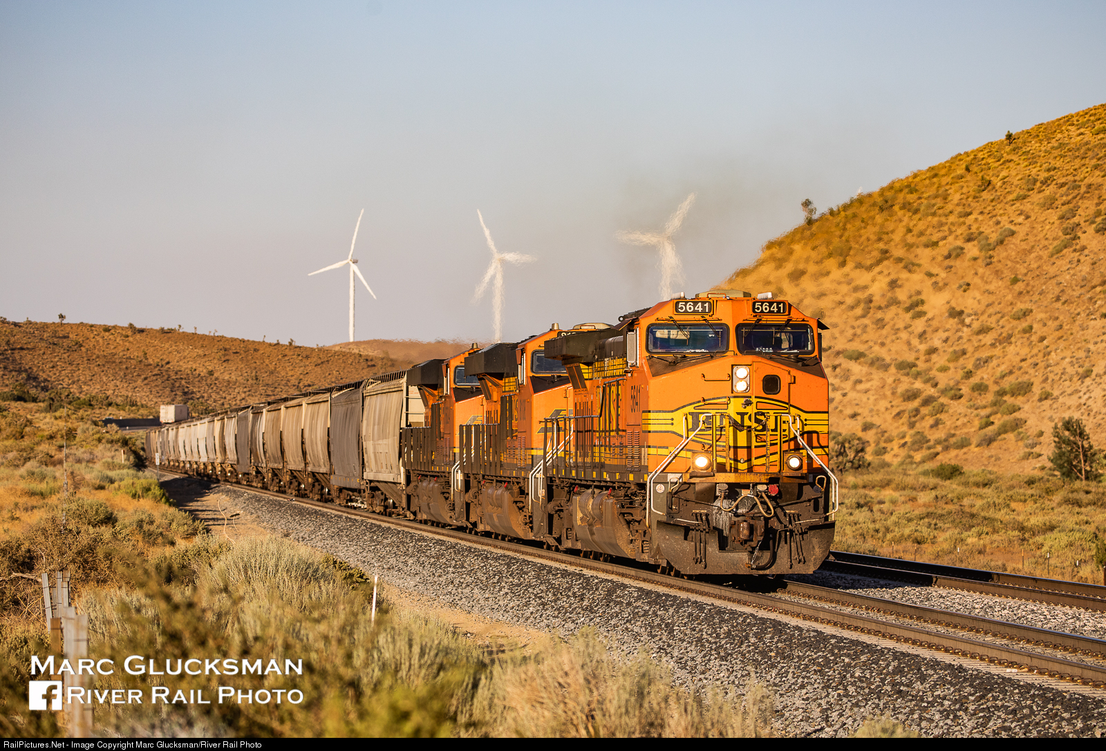 Wind powered? BNSF Railway 5641 (AC44CW) rolls by Tehachapi Pass near Cameron, California on the golden evening of Wednesday, July 23, 2020. The wind turbines of the Mojave Desert are prominent in the background, but all three diesels were on line as evidenced by the profound heat waves.