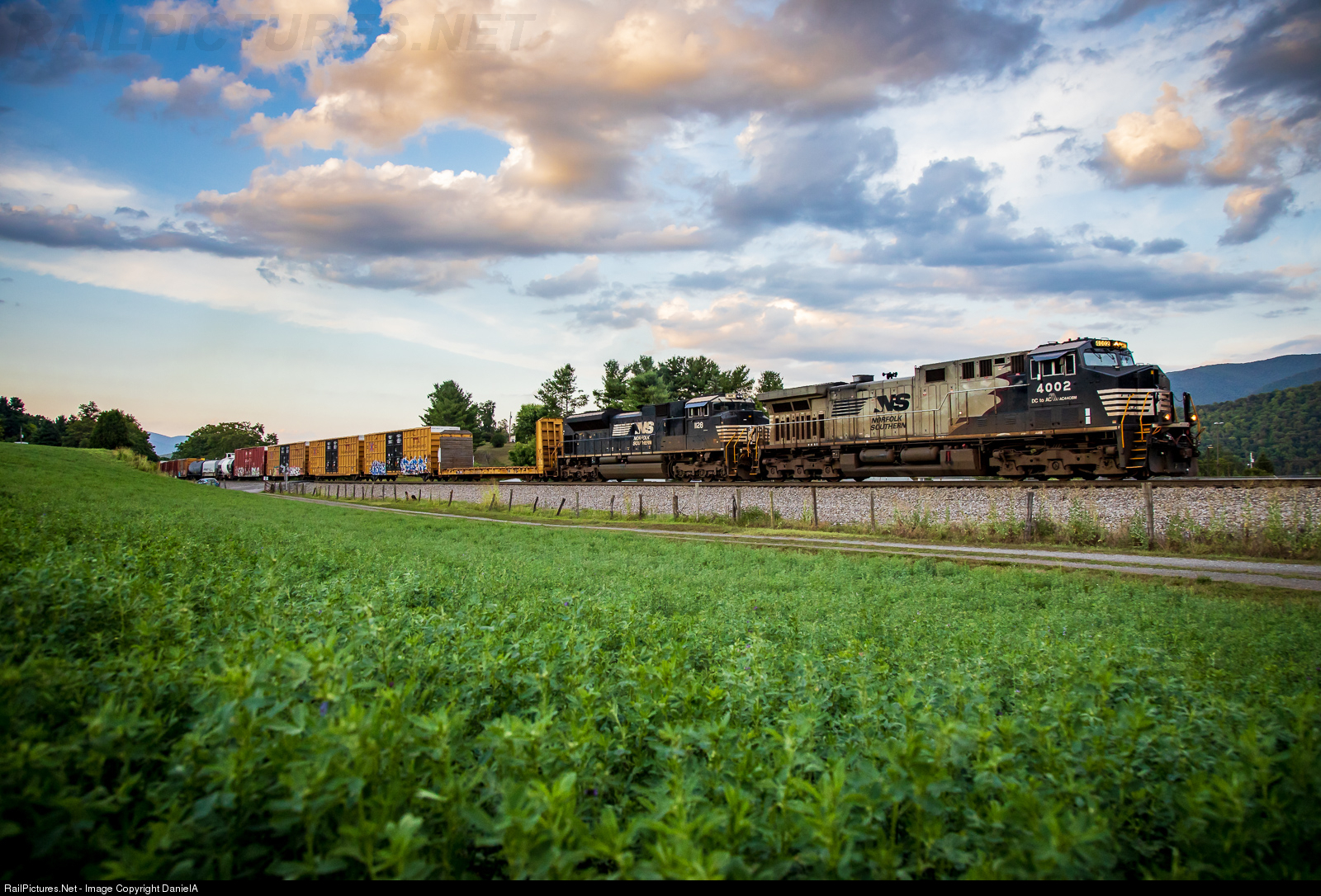 The sun has gone down over the mountain in Shawsville for the evening as NS M5T rumbles up grade with special paint scheme AC44C6M 4002 in the lead.