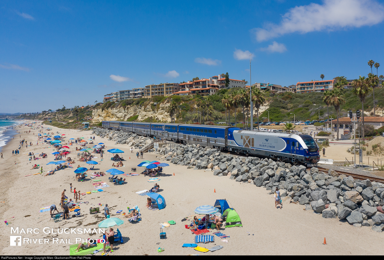 Beach train! Most of the beach-goers are keeping good social distance Amtrak Train 777 (Pacific Surfliner) passes through Calafia State Park in San Clemente, California on the afternoon of Friday, July 24, 2020. CDTX Charger SC-44 2121 represents the next generation of diesel engines that run for the various Amtrak California and other state supported services.