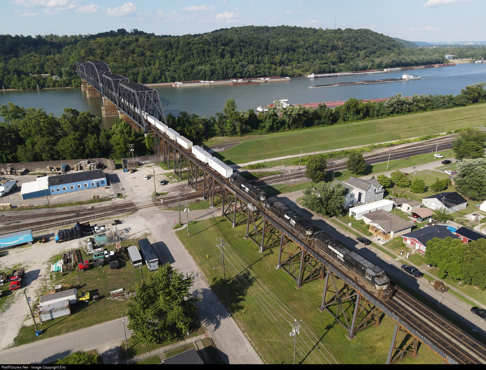 An eastbound Piggy Back crosses the Ohio River Bridge into Kenova West Virginia as Westbound coal loads head west on the River.