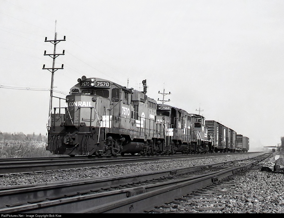 | A chop-nosed Geep leads a local freight on the old Reading Lines in the Lebanon Valley. No. 7570 was rebuilt from PRR GP9 No. 7063, built by EMD in October of 1956. |