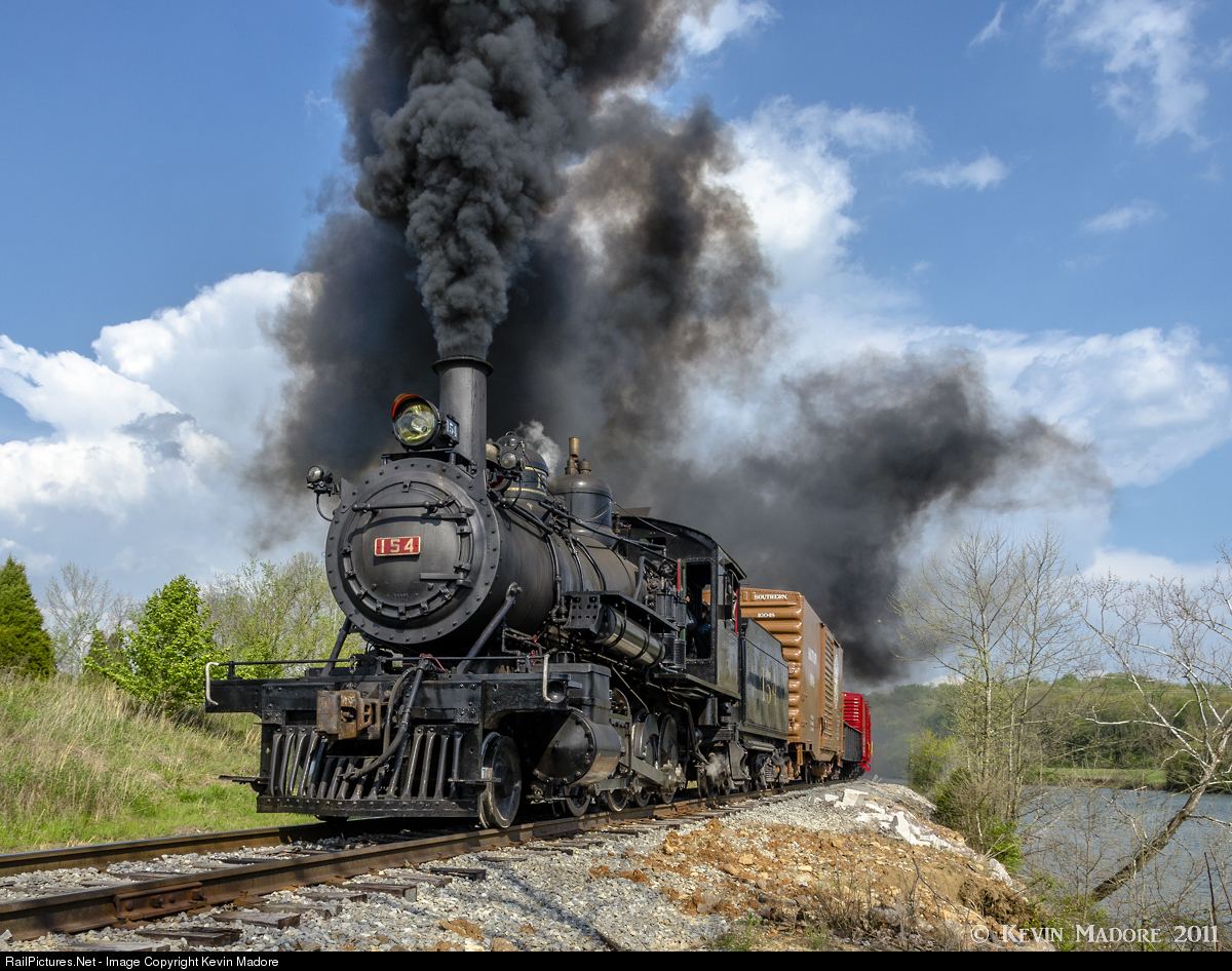 Westbound to Knoxville. Southern Railway Consolidation #154 runs westbound along the French Broad River just a few miles east of her home base in Knoxville, TN. She's hauling a local freight through an industrial district, where she's dropping fresh loads and picking up empties. Built in 1890, the 154 is the oldest surviving, operable, Southern Railway Locomotive. In this photo, she's performing for photographers attending a 2011 Historic Transport Preservation (HTP) Charter, hosted by John Craft.