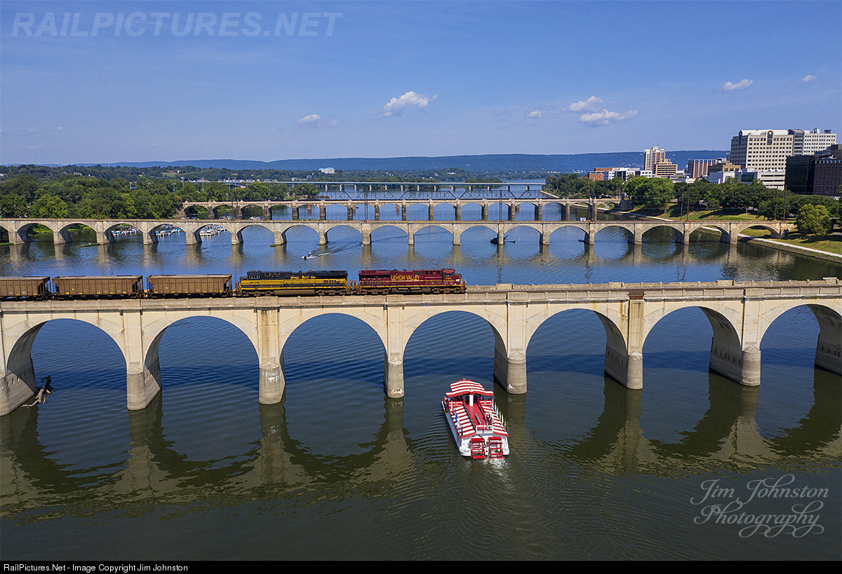 A beautiful morning for yet another double heritage unit set on the Lurgan. The LV 8104 and NKP 8100 lead NS 777 across the Susquehanna River and pause at CP Front Street as the passengers on the Pride of the Susquehanna Riverboat get a close look at the duo.