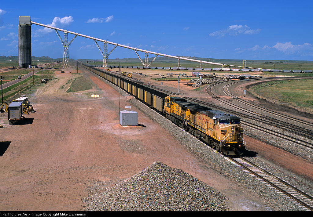 A Union Pacific coal train passes the bungalow at MP 43.0 at Reno Junction, Wyoming, on May 30, 2009. In the background, a train heads east on the spur out of Reno junction to either Black Thunder Mine or Black Thunder East Mine, while the actual loadout silo of Black Thunder West Mine can be seen on the left.