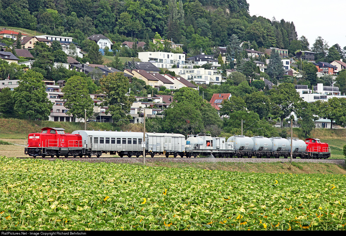 | A push pull train for killing weeds is en route from Basel to Singen, at the end of the train is 212 034. |