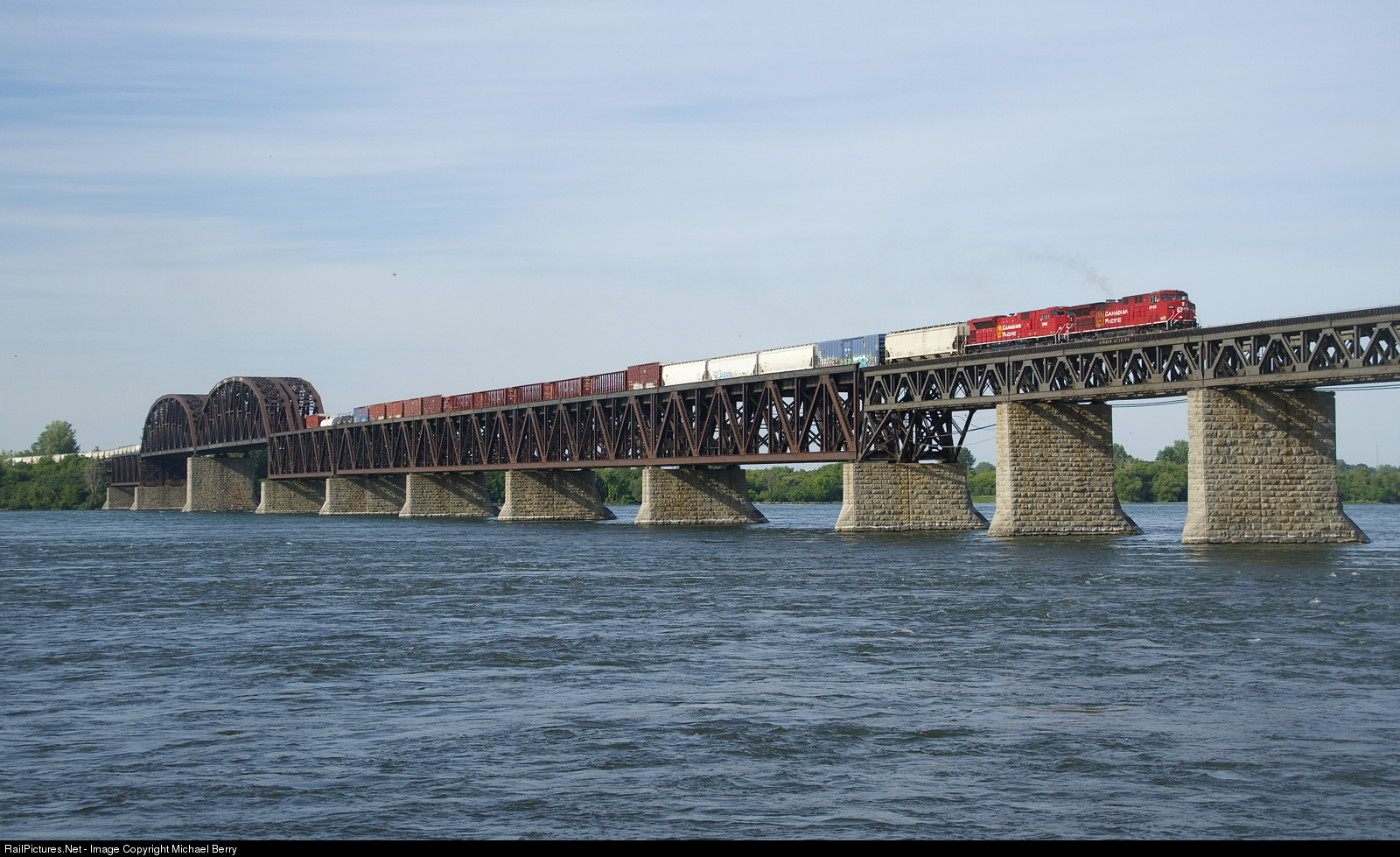 Repainted AC4400CW CP 9736 lets out a bit of smoke as it leads CP 253 across the St. Lawrence River, with SD70ACU CP 7043 trailing.