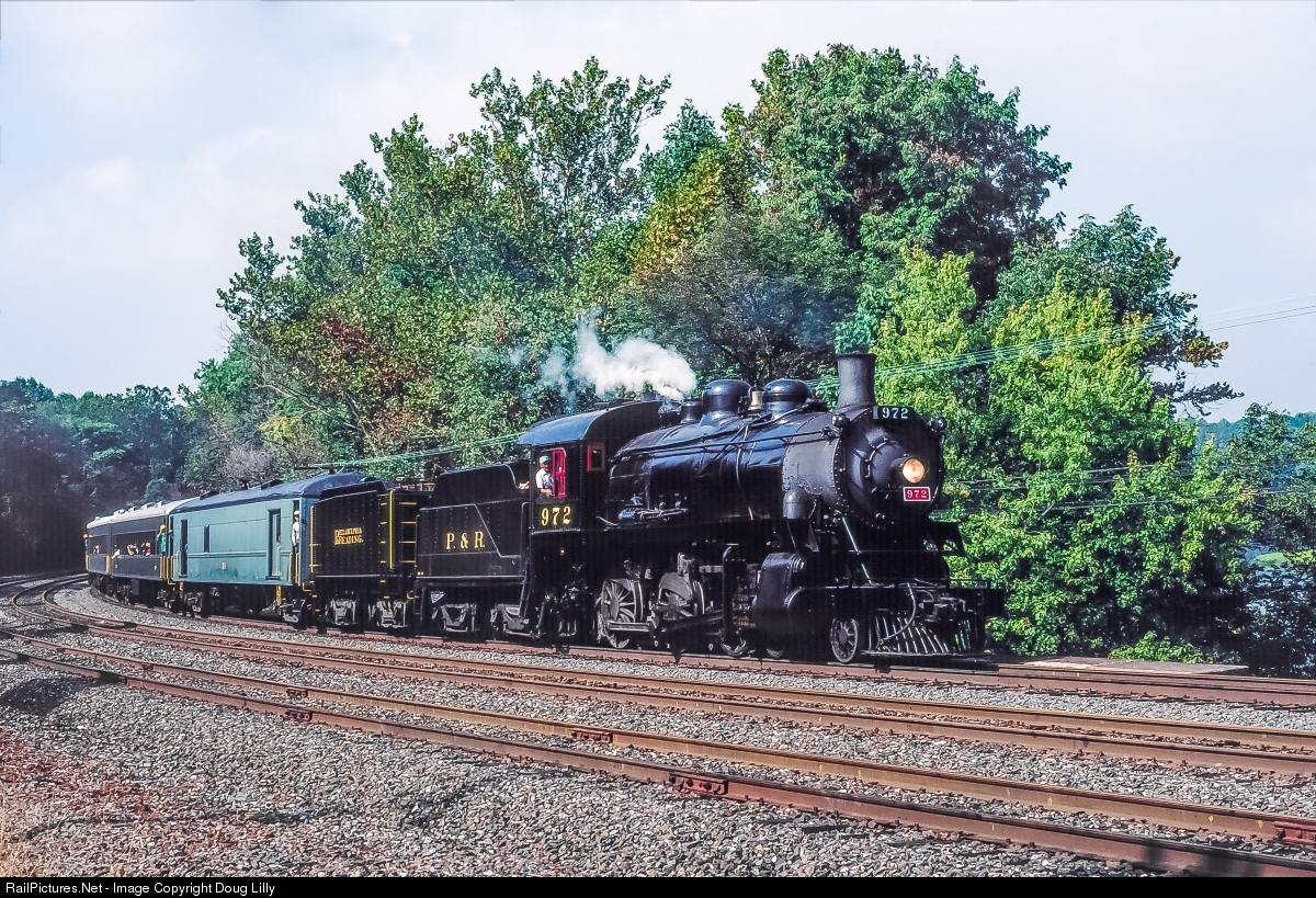 When the Delaware & Hudson celebrated its sesquicentennial in 1973, there were no D&H steam survivors, so Reading 4-8-4 2102 was fitted with “elephant ears” smoke deflectors and renumbered 302 to resemble a D&H 4-8-4 of the same number. Ironically, there were no operable Reading Company steam locomotives when its sesquicentennial occurred ten years later. George Hart’s Canadian Pacific ten-wheeler was enlisted to pull a series of main line excursions on Conrail’s ex-Reading lines. Lettered for Philadelphia & Reading, 972, which bore no resemblance to anything that ever graced the Reading’s roster, leads a Reading – Philadelphia trip east at Velley Forge, Pennsylvania.