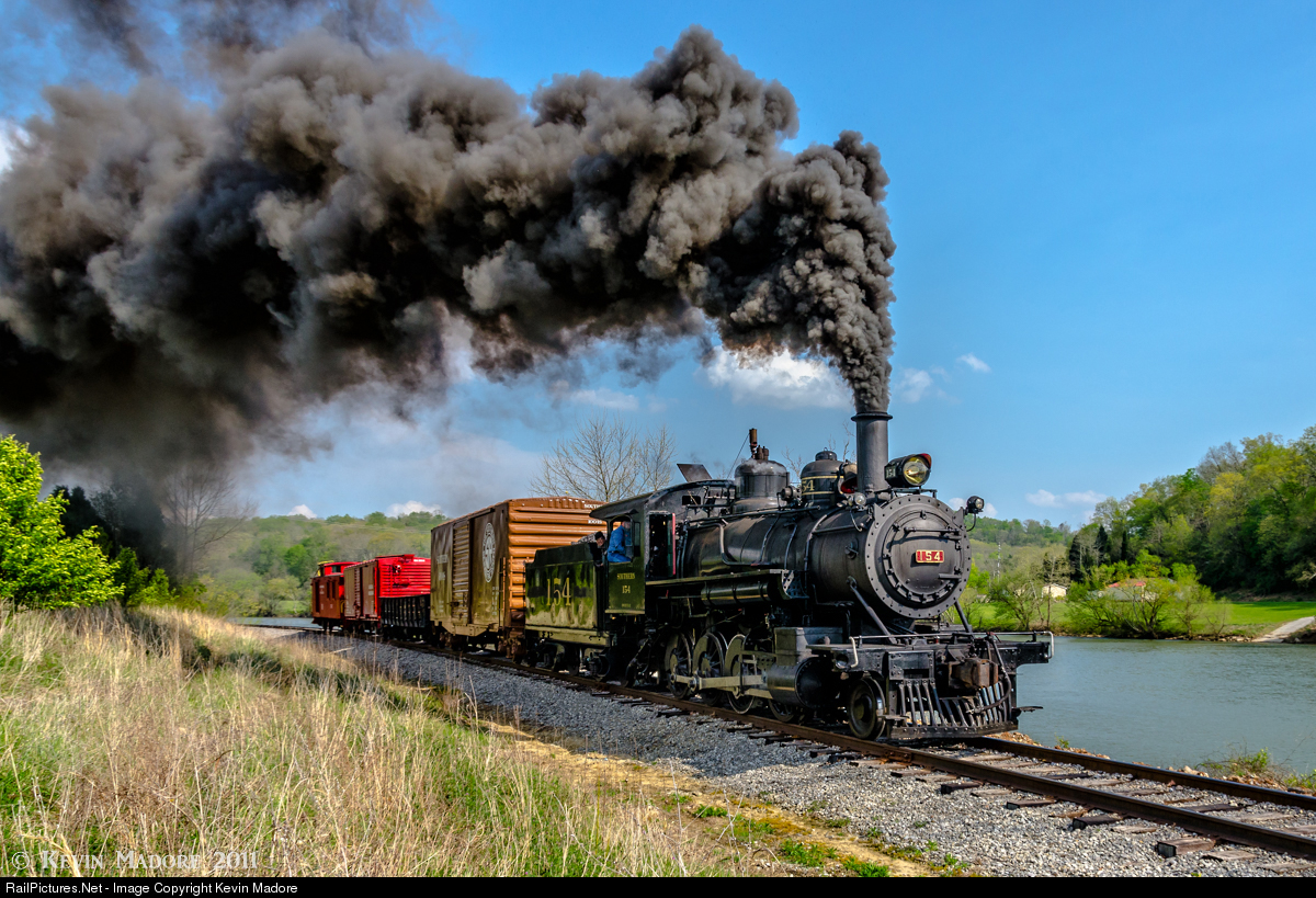 On the dark side at French Broad River. Here's a dark-side view of Southern Railway Consolidation #154. as she runs westbound on the shore of the French Broad River, hauling a local freight through an industrial district just a few miles east of her home base in Knoxville, TN. Built in 1890, the 154 is the oldest surviving, operable, Southern Railway Locomotive. In this photo, she's performing for photographers attending a 2011 Historic Transport Preservation (HTP) Charter, hosted by John Craft.