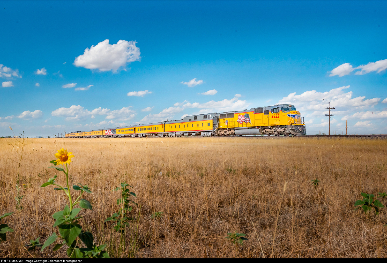 | Union Pacific hustles PCBDV 27 with number 4222 on the point at Fort Luptin, CO on July 27th 2020. 92 degrees and dry fields and sunflowers are a stark contrast from the Colorado high country this train will travel tomorrow. |