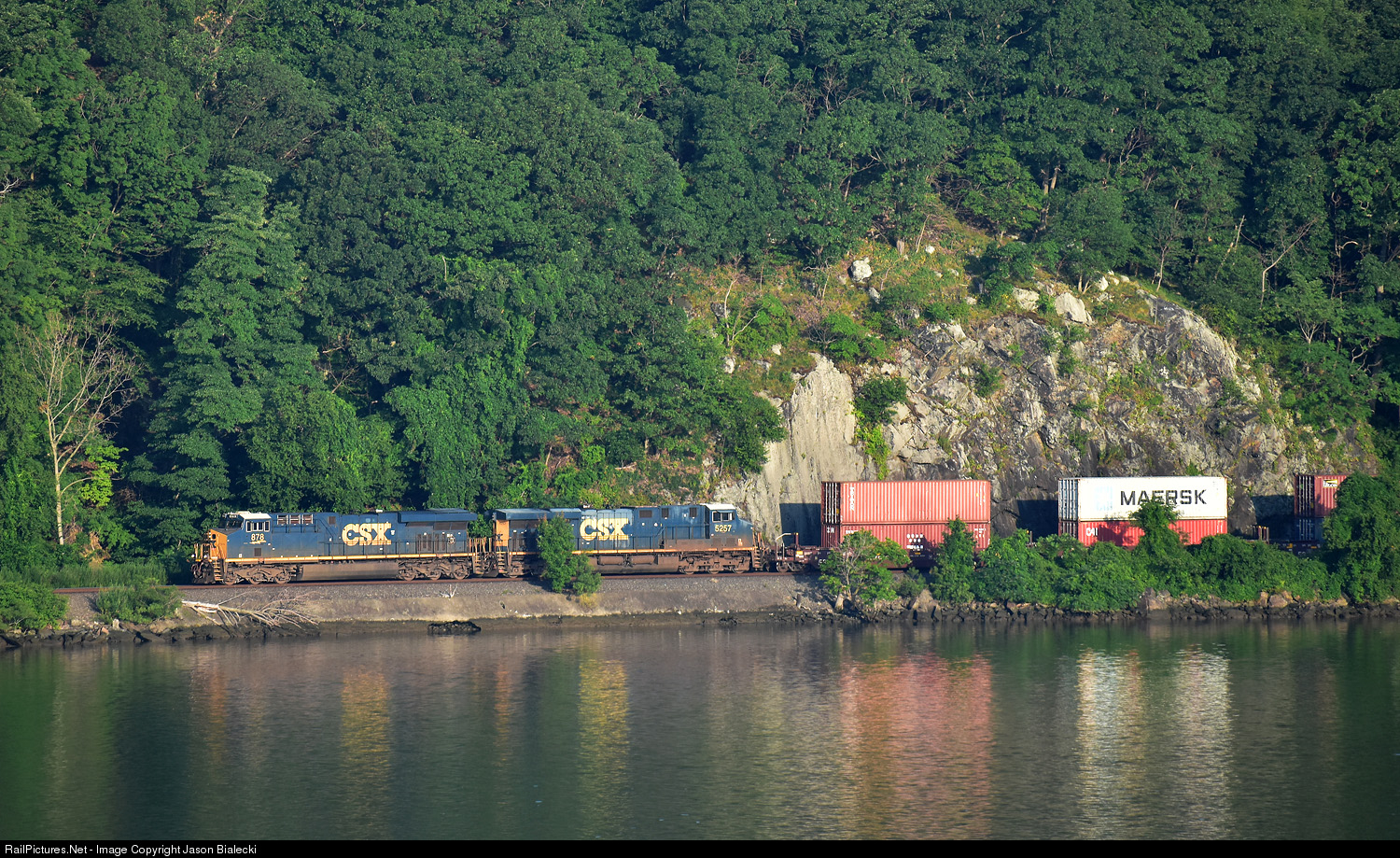 | A morning stack train rolls south through the Hudson River Valley just below Storm King Mountain. Photo taken from Little Stony Point. This location gives great views of the Hudson River and Freight line that runs along its western shores. |