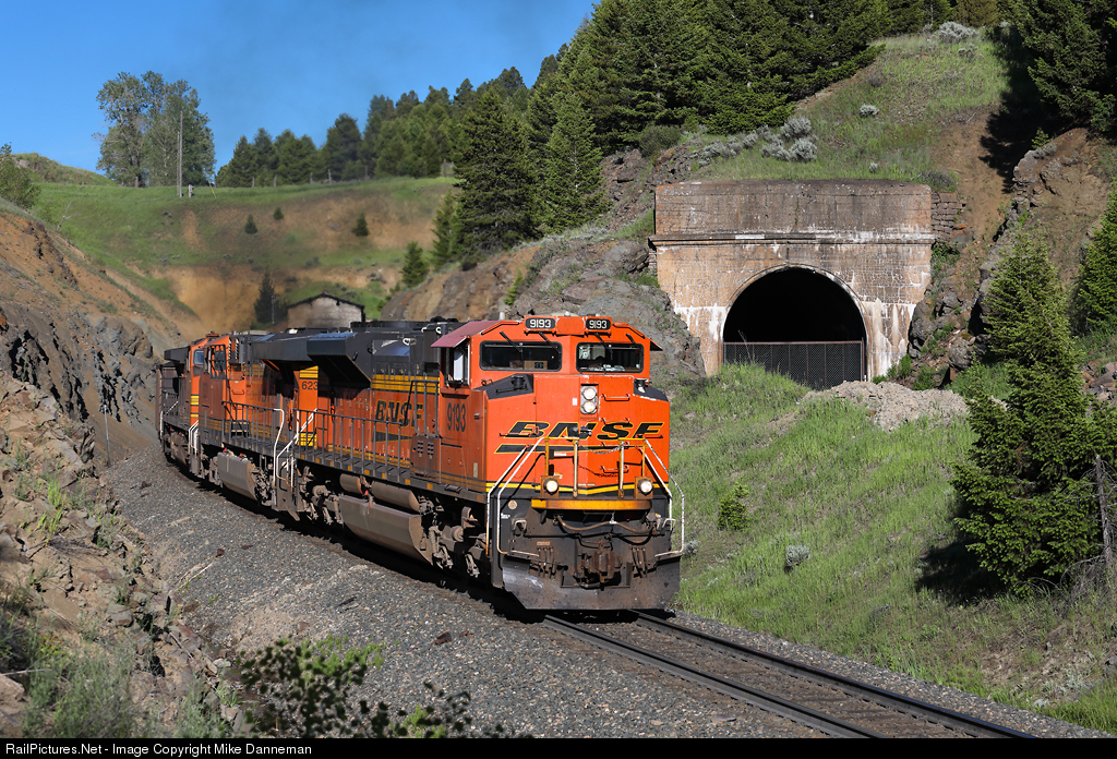 A westbound BNSF unit coal train tops the summit at Bozeman Pass at it exits Bozeman Pass Tunnel in a cut at West End, Montana, on June 23, 2020. The longer and more-restrictive original bore is on the right, and was bypassed when the new Bozeman Pass Tunnel opened for traffic on July 28, 1945.