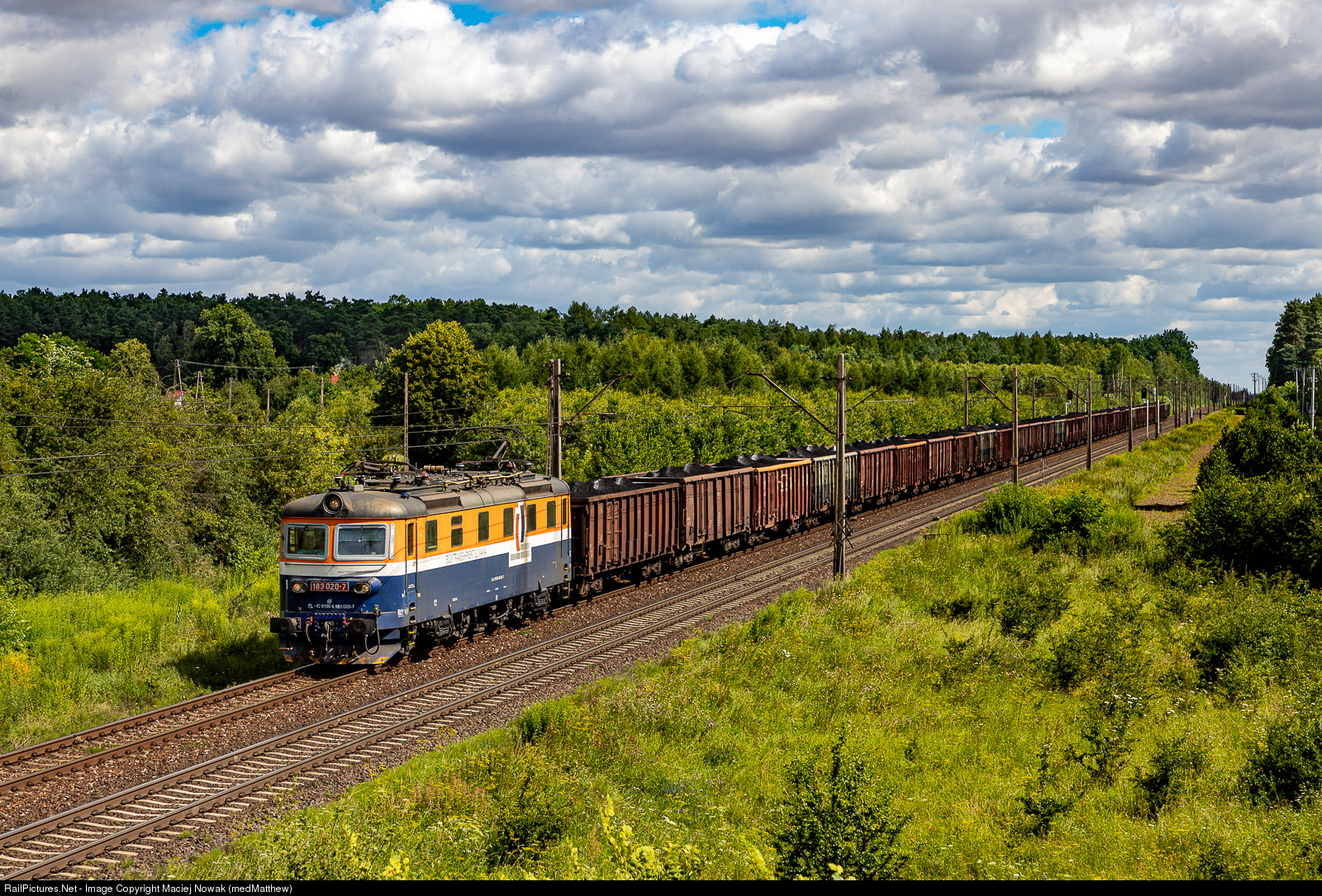 Southbound freight train with electric locomotive 183-020-7 approaching Maksymilianowo. The train hauling 33 cars full of coal.