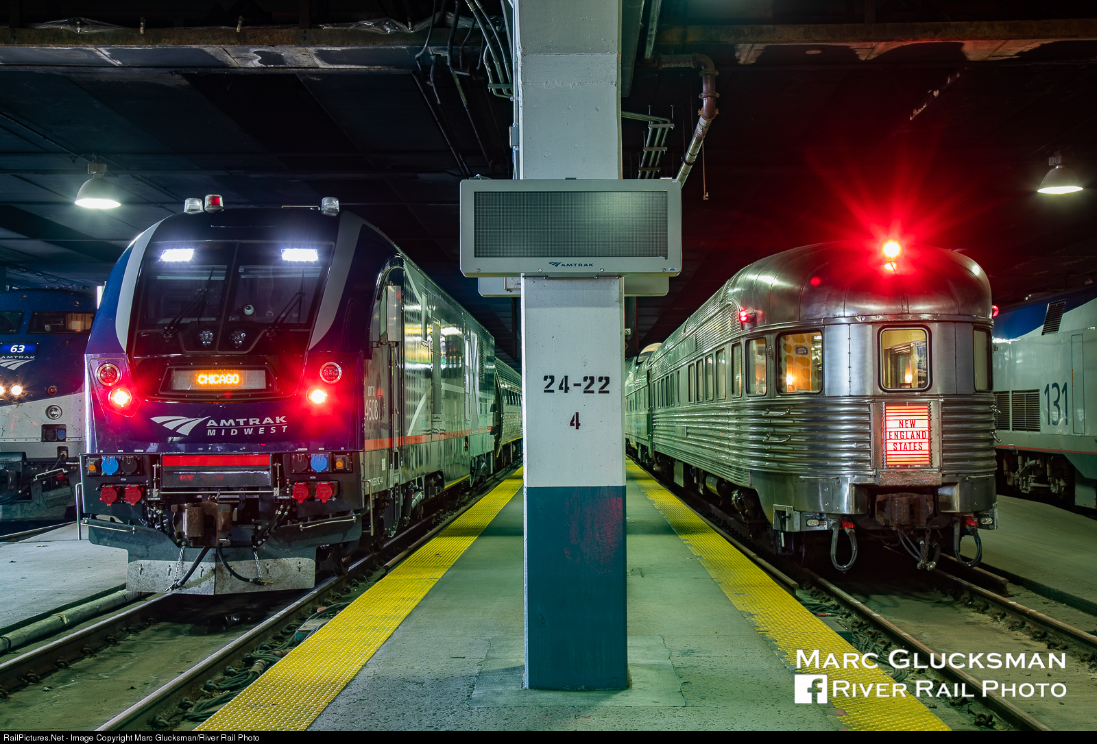 Webb Rail's former Northern Pacific Railway Budd built Pullman dome/sleeper 313 (WEBX 801044) and former New York Central Railroad Budd built Pullman obs/diner/sleeper "Babbling Brook" (WEBX 800007) sit on the platform at Chicago Union Station. Amtrak (IDTX) 4608 (Siemens, SC-44) awaits its next departure.