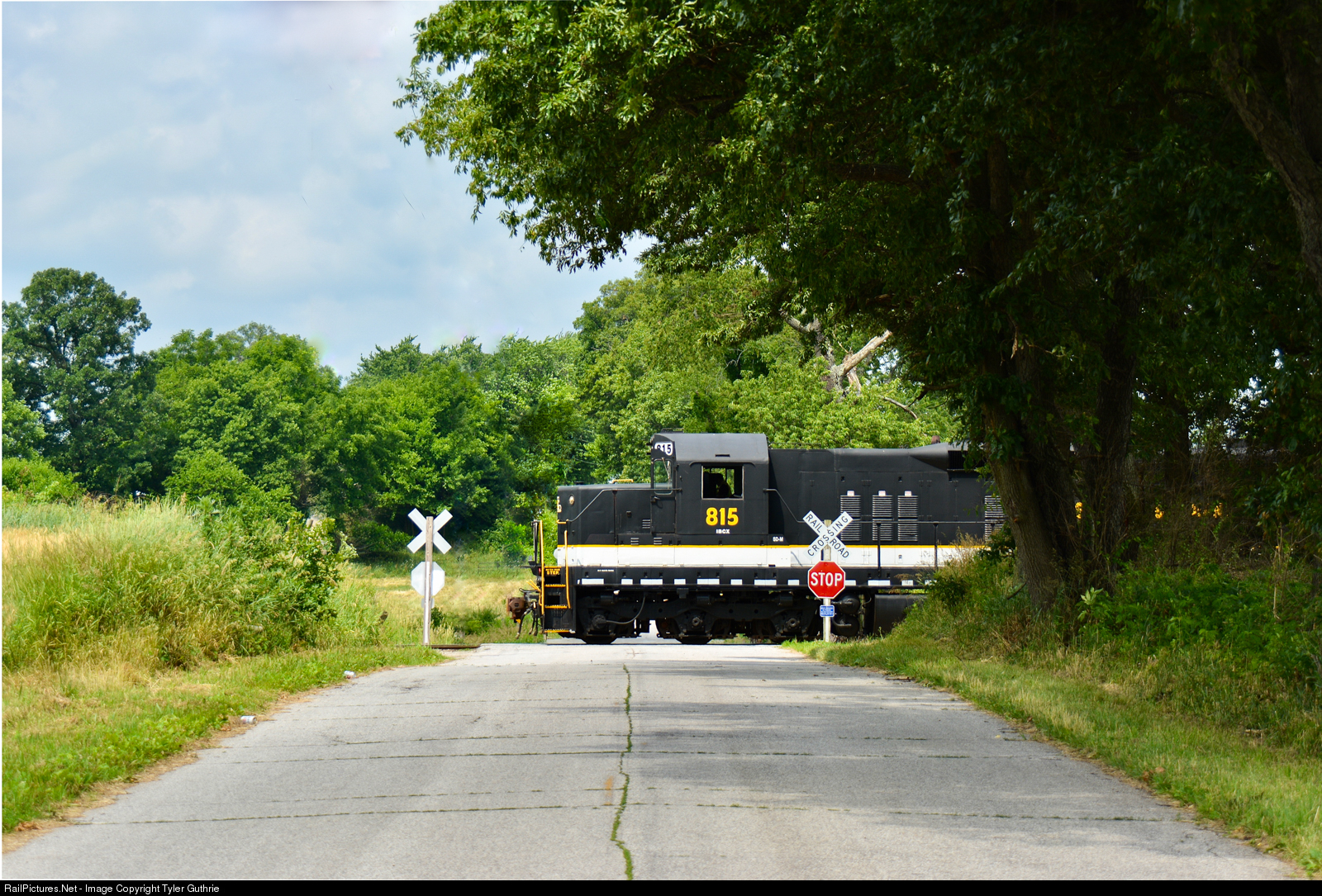 | IBCX 815, a rebuilt SD18, sits across a county road near Union Mills while the conductor prepares to help switch the grain elevator. |
