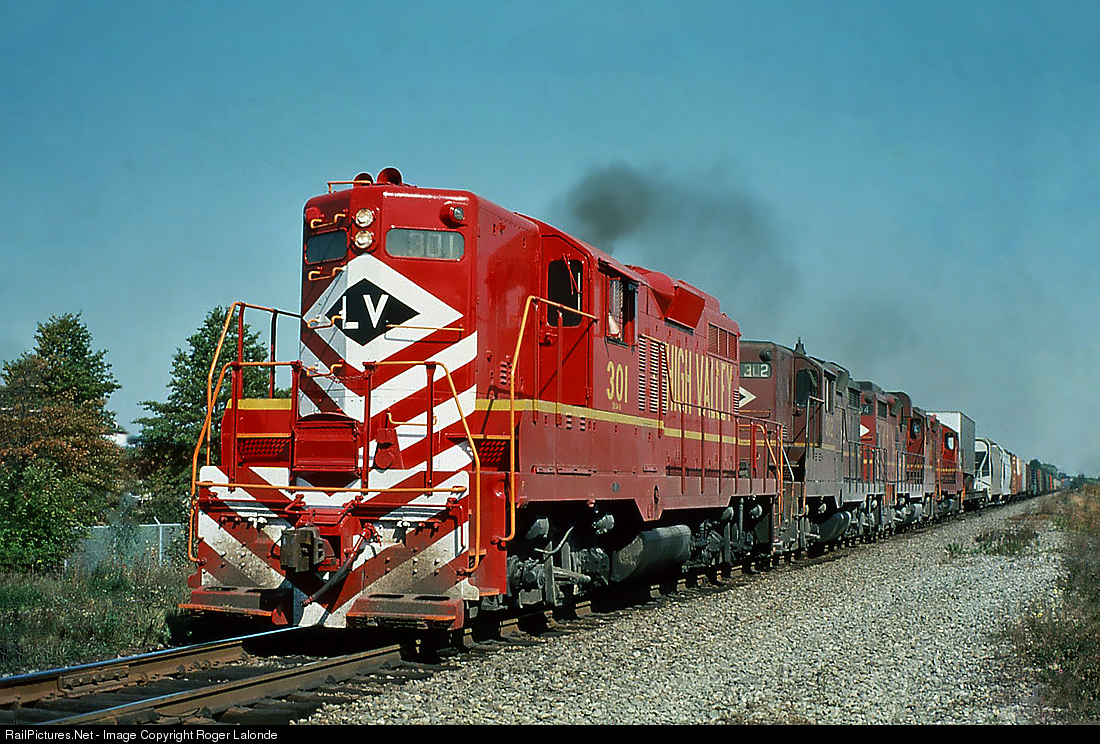 One of only two on the LV roster, freshly painted GP9 #301 leads three nearly externally identical GP18's, westbound at Manville, New Jersey in September 1974. No photographer listed on side, from my collection.