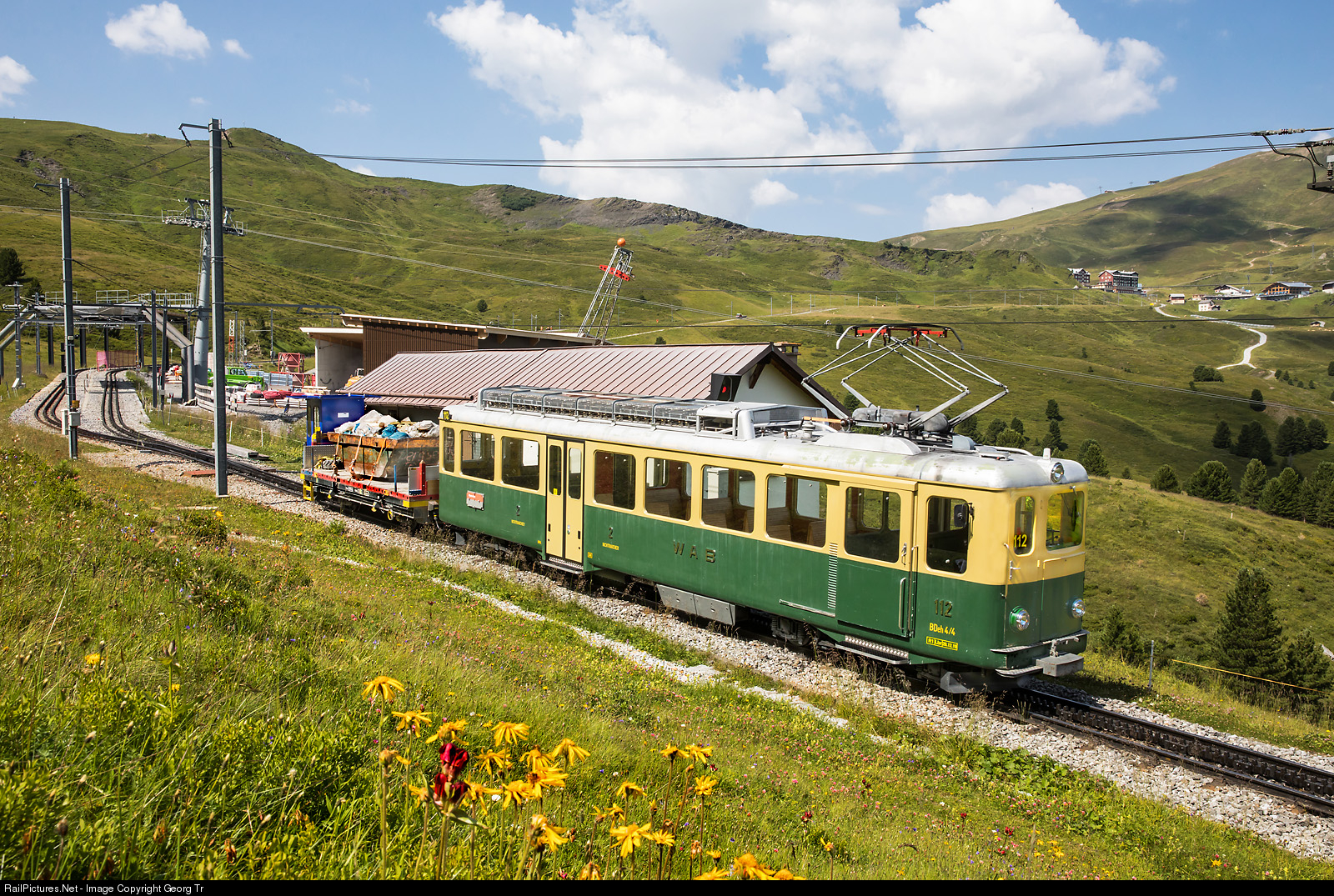 Cogwheel freighttrain of the Wengernalpbahn leaving Salzegg for Grindelwald Grund. Railcar BDhe 4/4 # 112 from 1963 is pulling freight car X # 770, which was built in 2017 by the WAB/Steck and Brun. This is a platform car for the transport of stillage with several goods loaded. In the background is the temporary transshipment station, from were the paltforms are transported by a ropeway to the Eigergletscher, for the construction works new ropeway Grindelwald-Eigergletscher, which will open in december 2020. One of the masts which you can see, is of the chairlift Arvengarten-Eigergletscher from 2009, running over the Salzegg station.