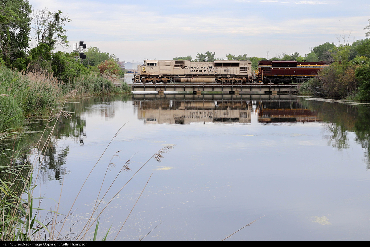| CP 7021 leads CSX V101 west over the Grand Calumet River in East Chicago, Indiana. 7021 is one of five special military units the CP released in 2019. |