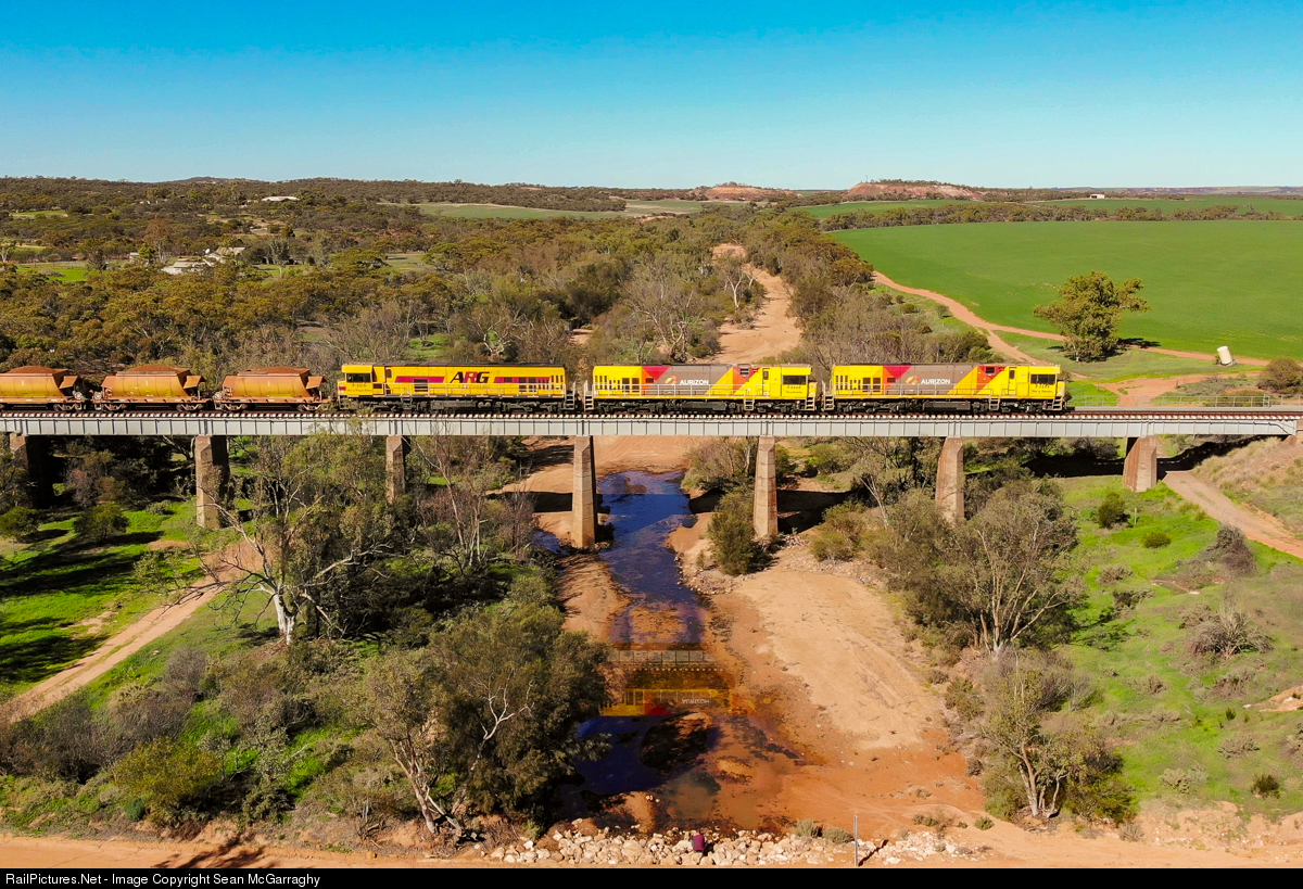 | Another angle of the Greenough River Rail Bridge at Eradu with the drone captures P2504, P2506 & P2514 working 7721 loaded Mt Gibson ore from Perenjori to Geraldton |