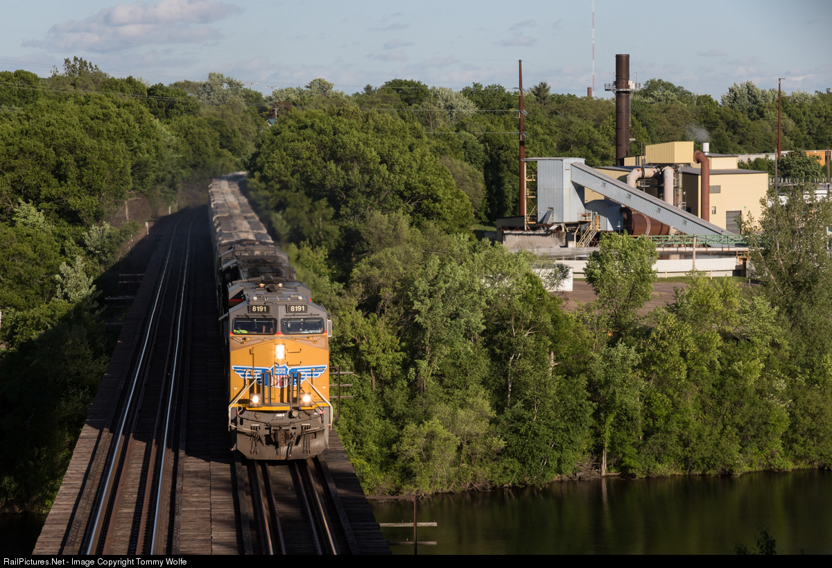 | UP train MBUWN-02 is seen crossing the 924 foot "New" Chippewa River Bridge in Eau Claire Wisconsin. This bridge was completed in 1912 by the Chicago and Northwestern and it succeed a bridge that dates back to the 1870s built about 1,000 yards to the south. |