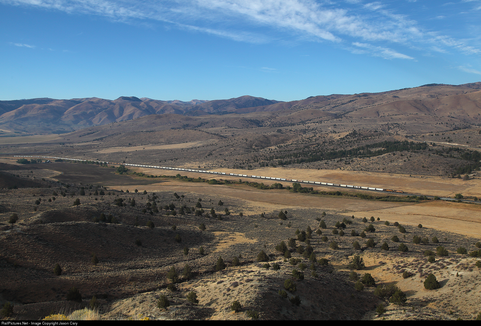 Built for Battle This westbound Soda Ash train was built in Pocatello to battle the grades of the Pacific Northwest. The train left the Wyoming Soda Mines 2x1. In Pocatello the train added a 5 unit swing help. The extra power is for the Reverse hill, Encina Hill (Hindman) and the Blue Mountain Grade. The train here is about to start into the 2.2% Durkee loop, the top of which can be seen in the upper right.