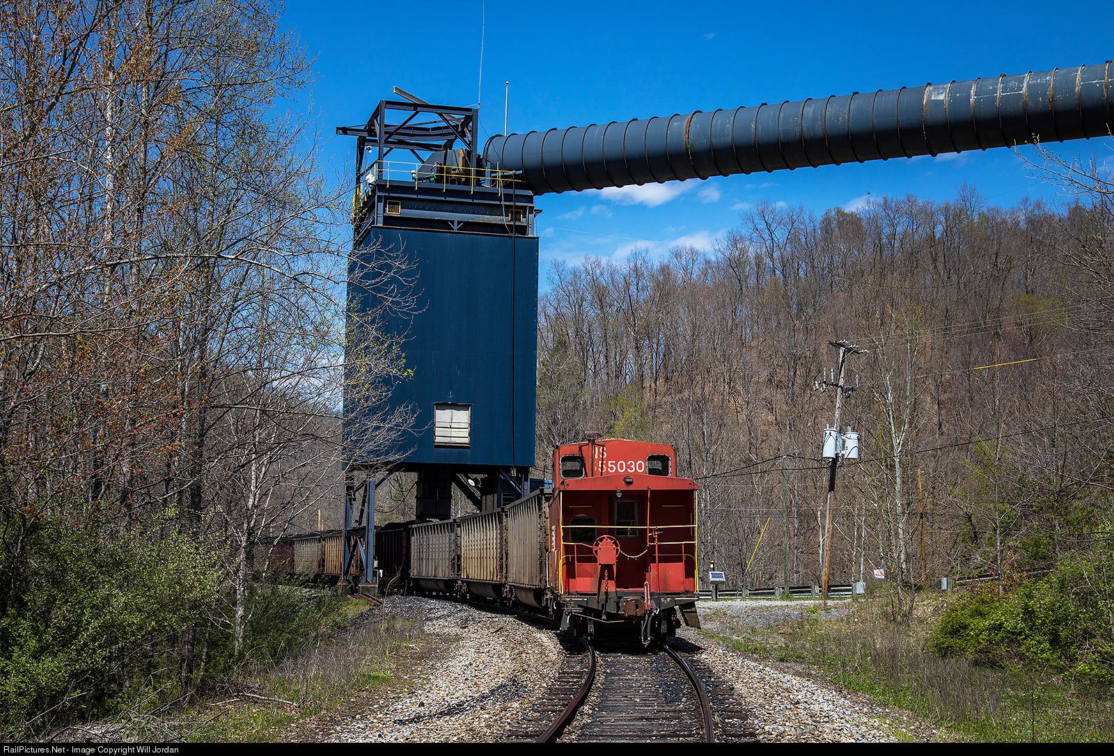 The last cars are being loaded with West Virginia black diamonds at the Cub Creek loadout with a former N&W shoving platform on the rear.