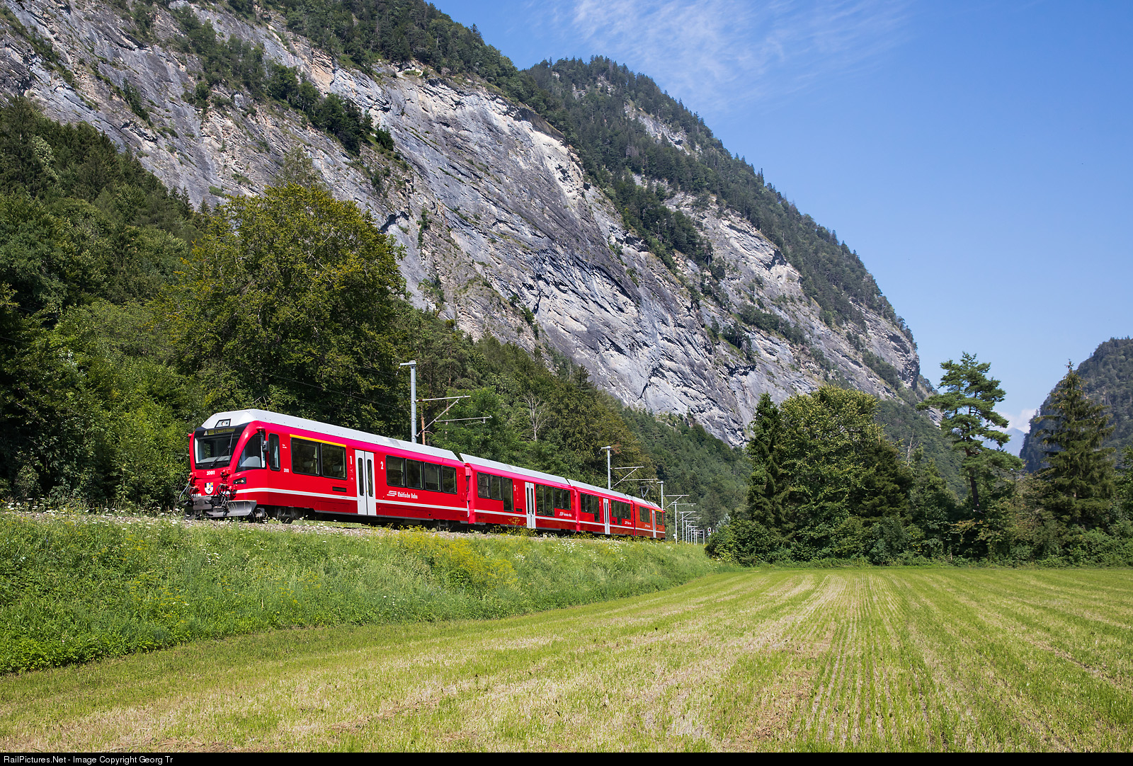 | In front of an impressive several hundred meter high rock face, the ABe 4/16 trainset # 3101 of the Rhaetian Railway is running the S1 service 1525 from Schiers via Landquart-Chur to Rhäzüns. The RhB has 5 of this trains, mostly used for cummuter services between Thusis, Chur and Schiers. |