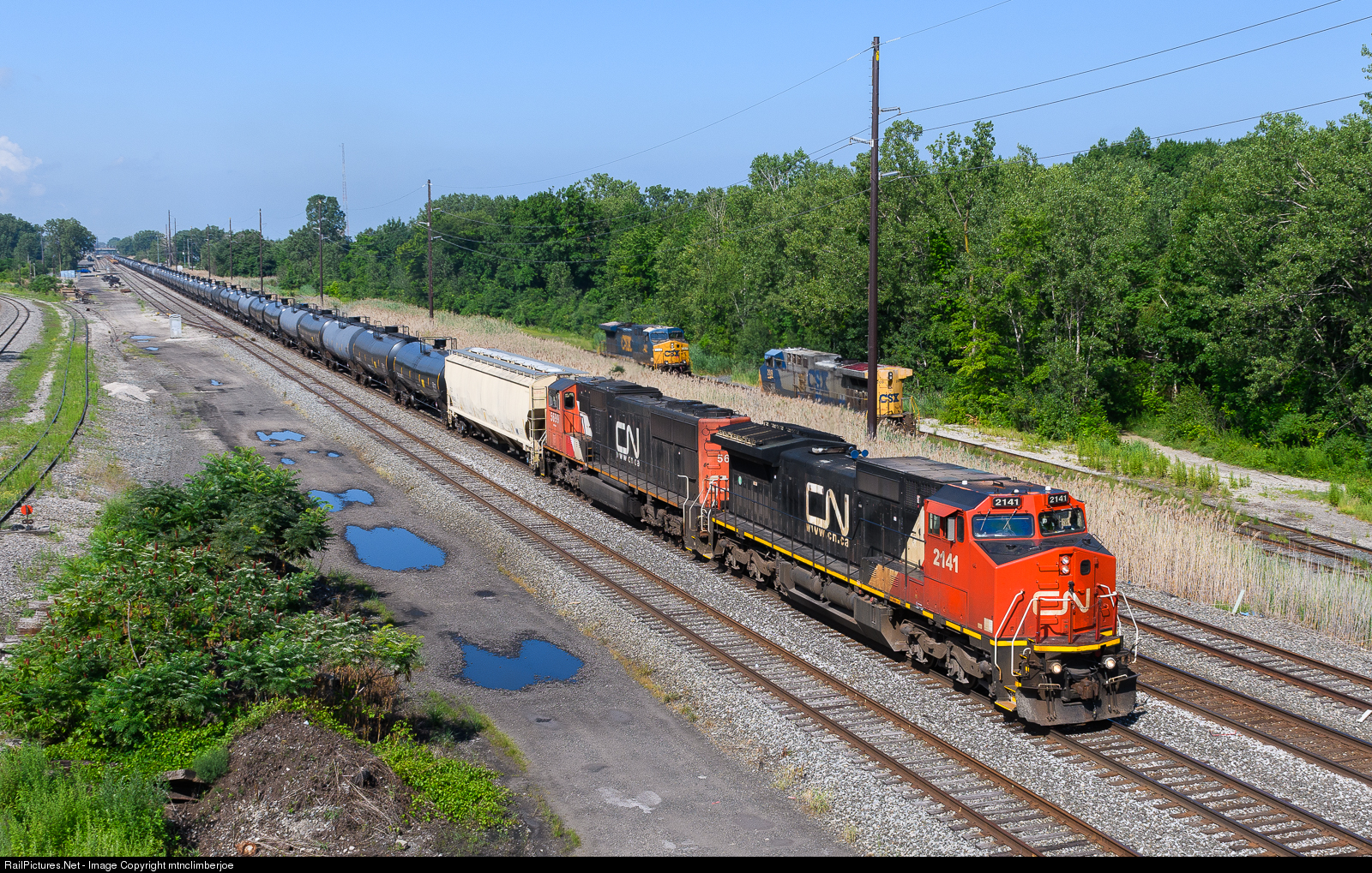| A pair of Canadian National locomotives lead eastbound CSX ethanol train K684 through Erie, Pennsylvania after holding at CP 89 for Q020 to pass. In the lead is C40-8W CN 2141, originally built as ATSF 812. |